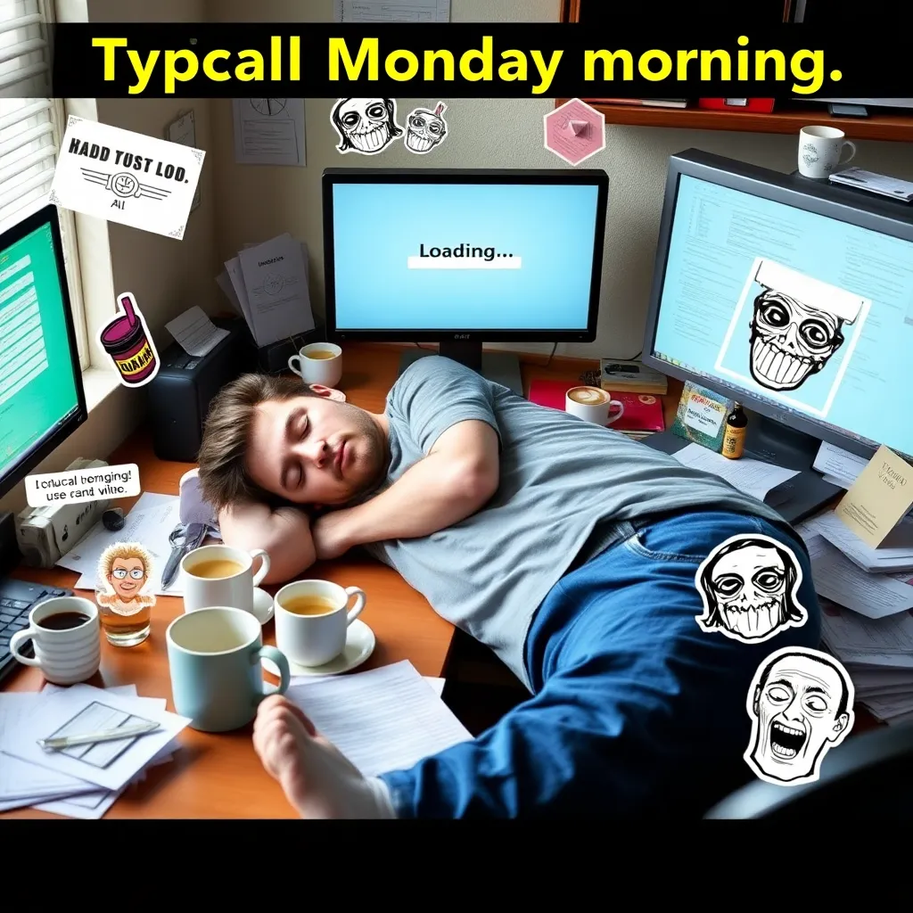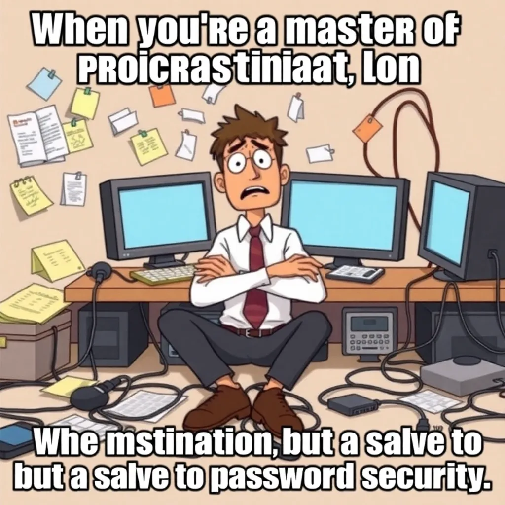 Create a humorous meme video showcasing a relatable struggle of trying to remember passwords and login credentials. Feature a frustrated character surrounded by scattered notes, computer screens, and tangled cords, with a caption like 'When you're a master of procrastination but a slave to password security'.
