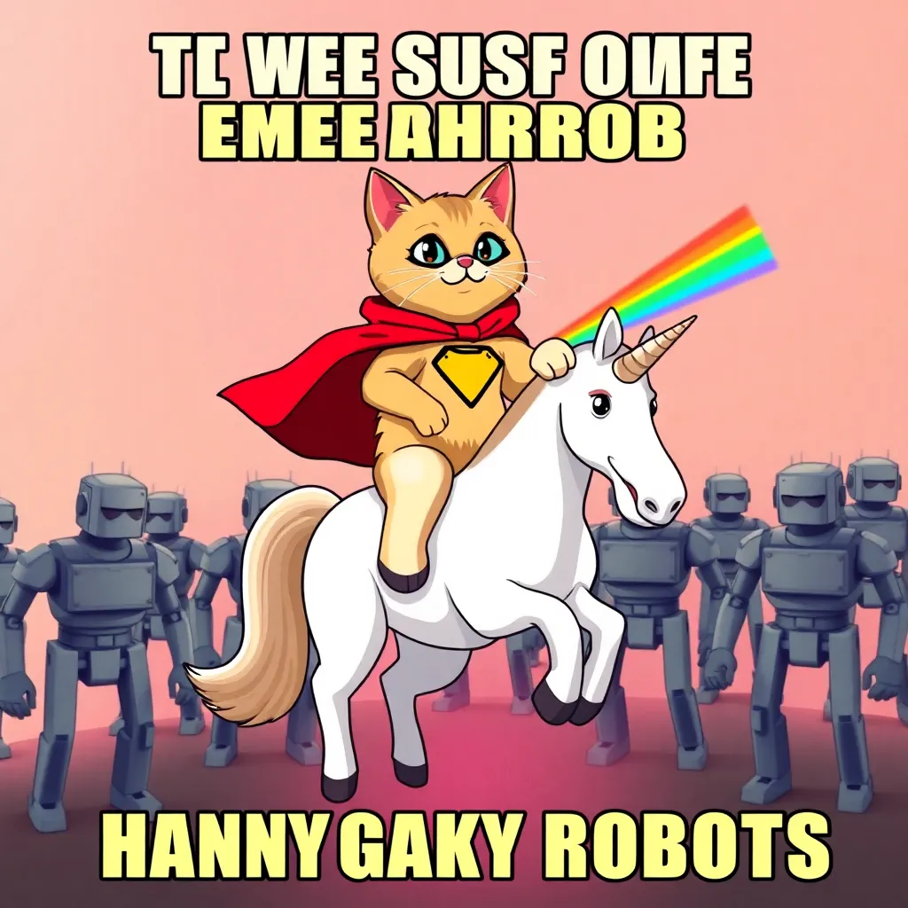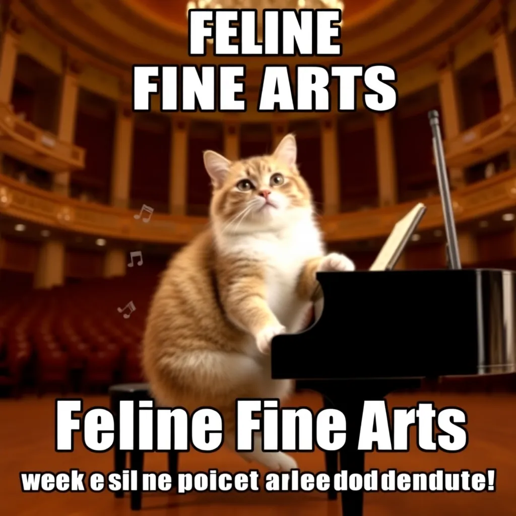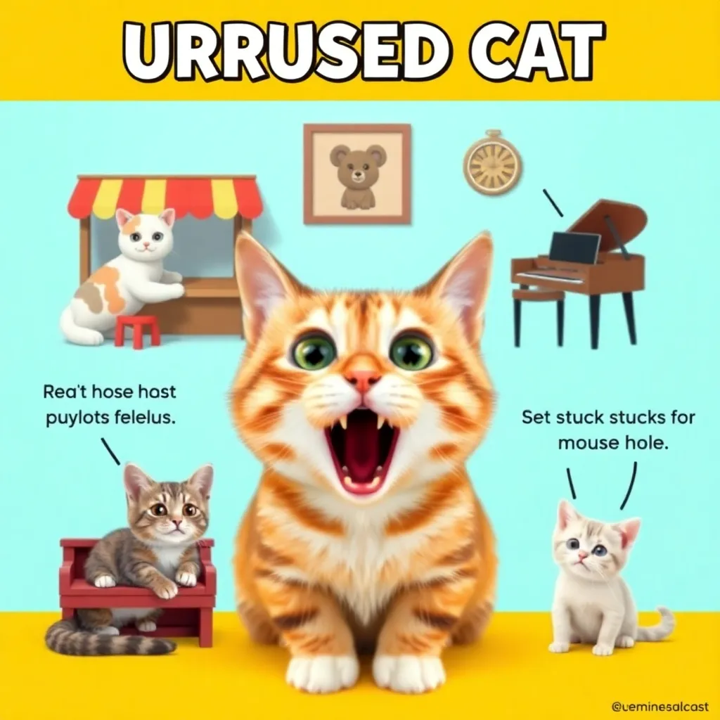 Create a humorous meme video featuring a 'urprised cat' reacting to a series of ridiculous scenarios, such as a cat cafe with robotic felines, a cat playing the piano, or a cat getting stuck in a mouse hole. Use bright colors, exaggerated expressions, and funny sound effects to make it entertaining.