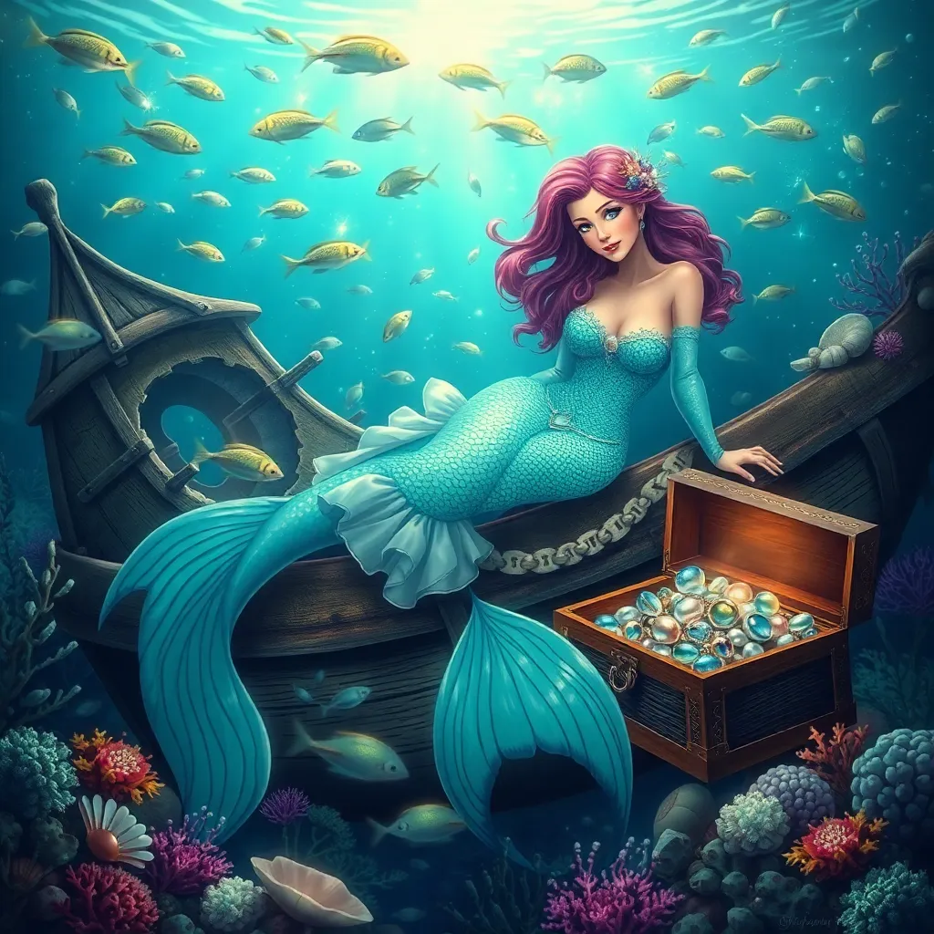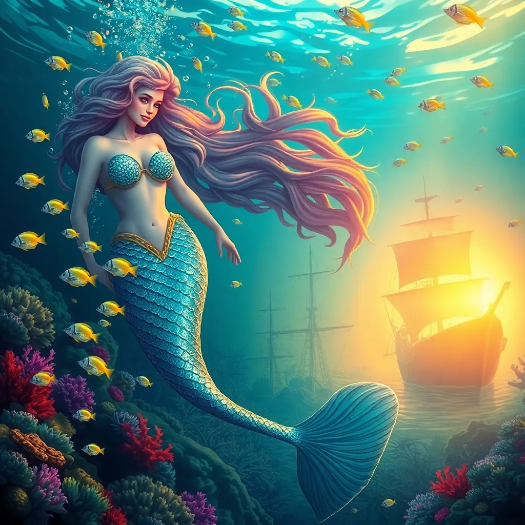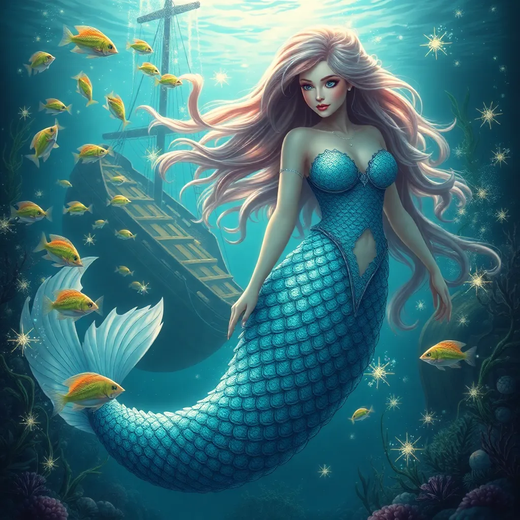 Create an enchanting underwater scene featuring a majestic mermaid with shimmering scales, flowing locks, and a mesmerizing gaze. The mermaid should be surrounded by a school of sparkling fish, coral, and seaweed, with a sunken ship or treasure chest in the background. Incorporate a sense of mystique and wonder.