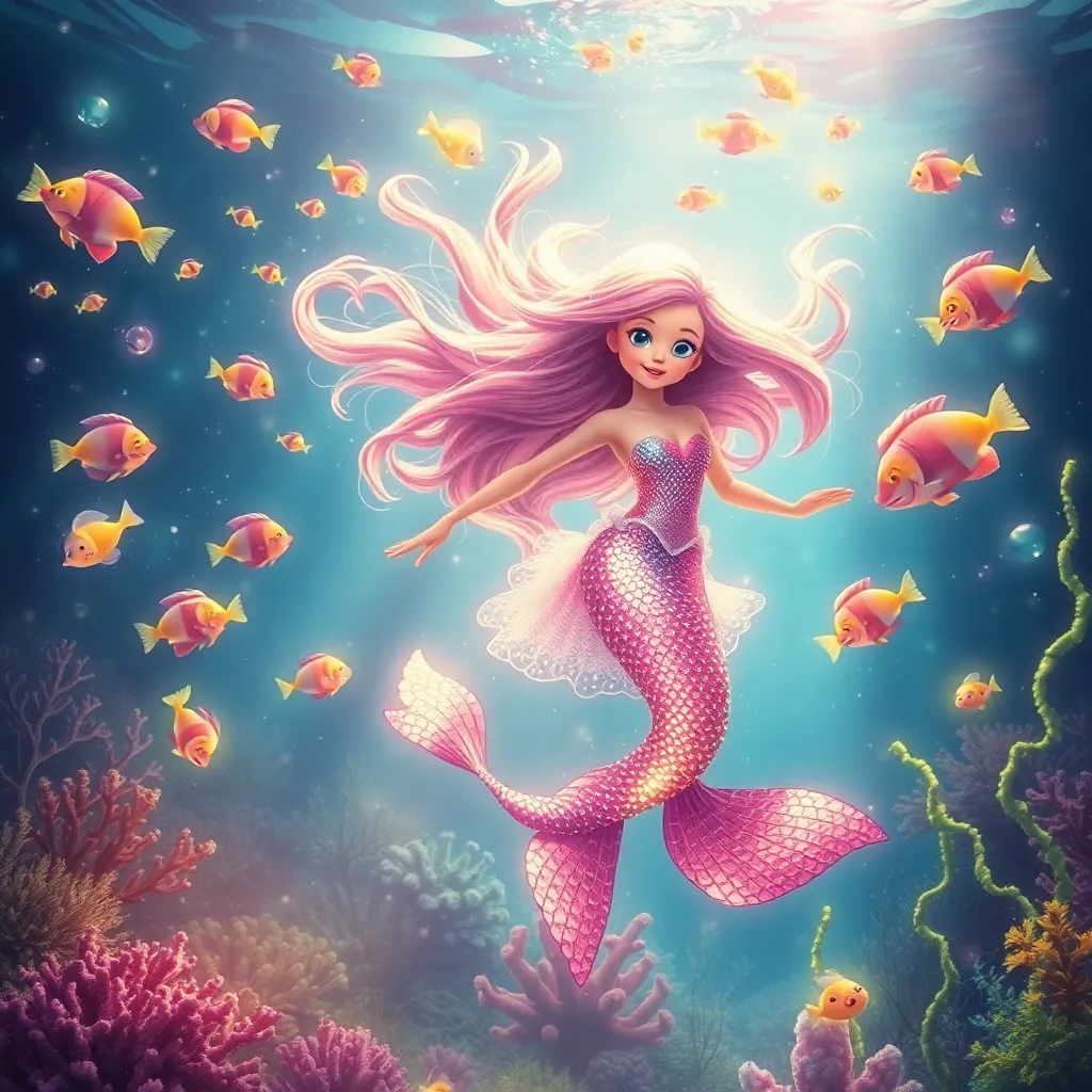 Imagine a whimsical underwater scene where a shimmering mermaid, adorned with iridescent scales and flowing locks, swims alongside a schools of rainbow-colored fish and playful sea creatures, surrounded by coral and seaweed, with a subtle glow emanating from the ocean floor. Create an enchanting AI image that captures this magical moment.