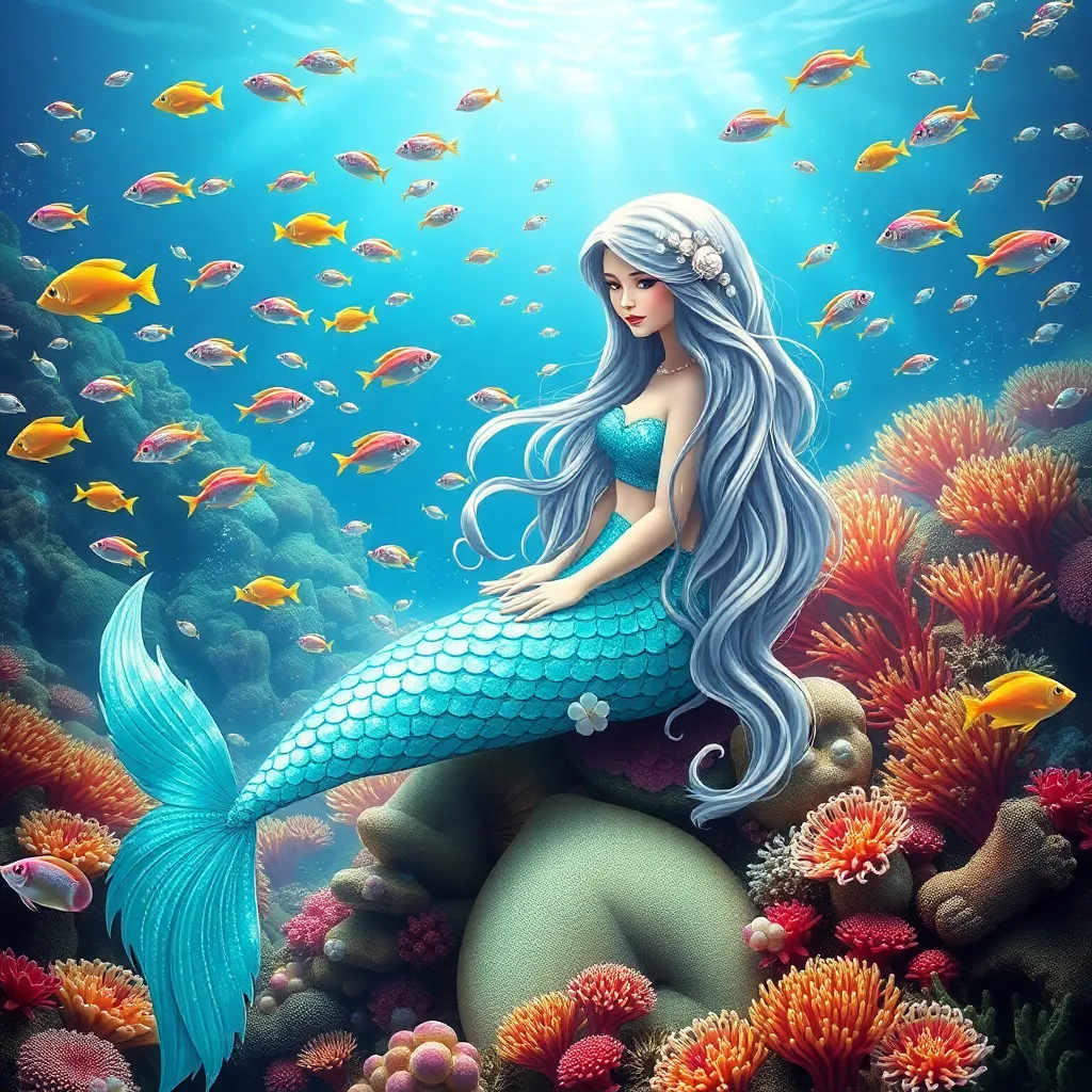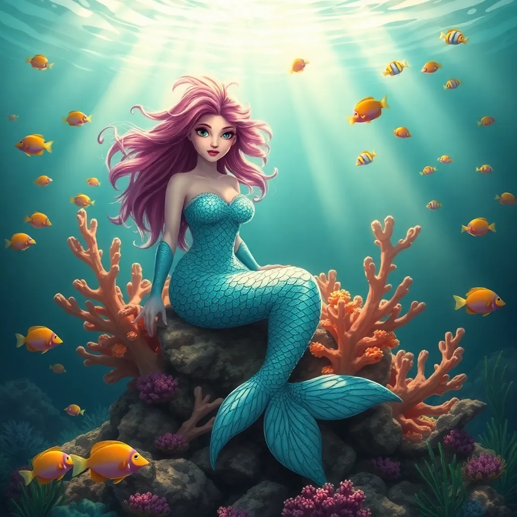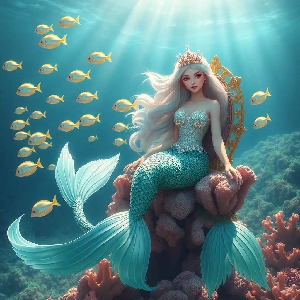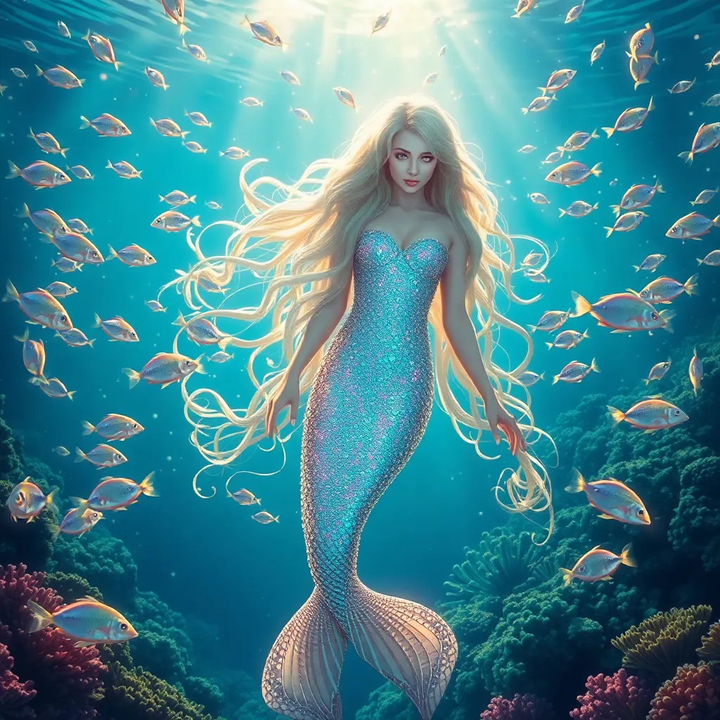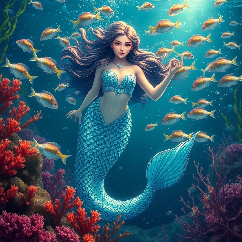 Create an enchanting underwater scene featuring a majestic mermaid with shimmering scales, flowing locks, and a mesmerizing gaze. Surrounded by vibrant sea creatures, she sits atop a coral reef, with a school of sparkling fish swimming in harmony. The atmosphere is whimsical, with a touch of mystique and wonder.