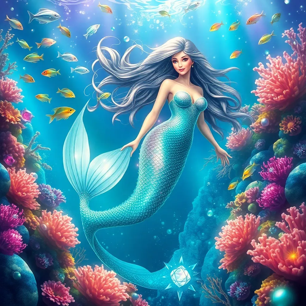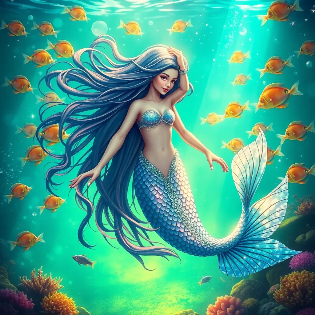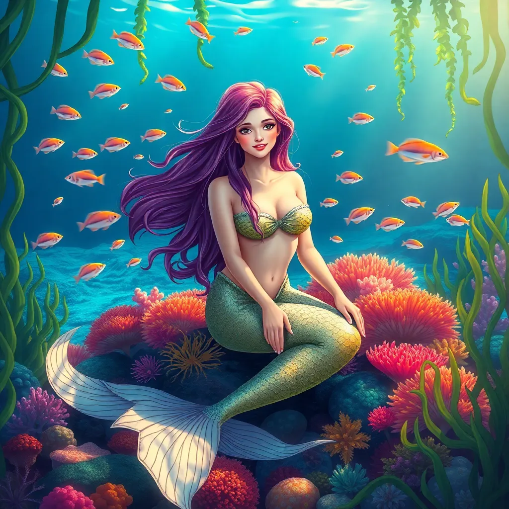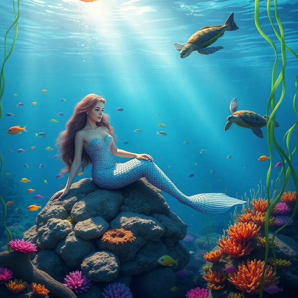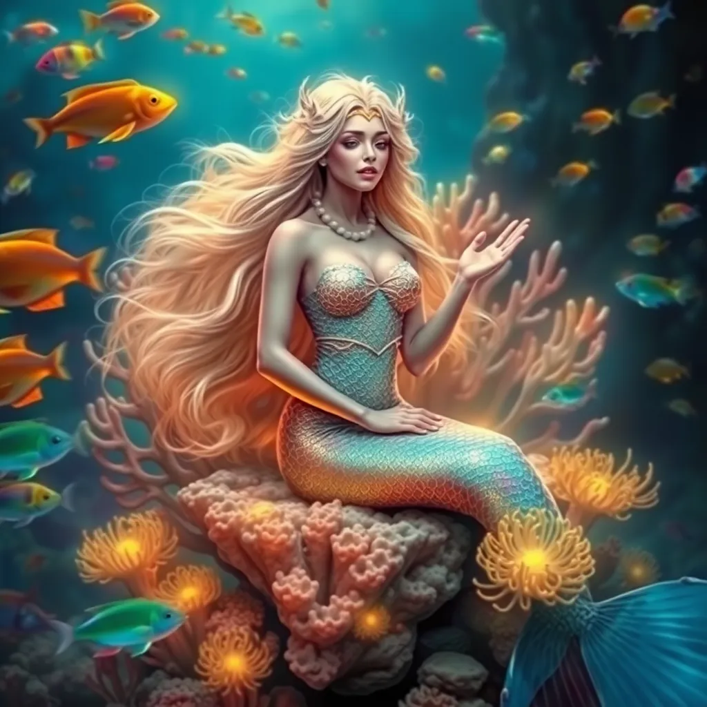 Create an enchanting underwater scene featuring a majestic mermaid with shimmering scales, flowing locks, and a mesmerizing gaze. Surrounded by vibrant sea creatures, she sits atop a coral reef, with a school of sparkling fish swimming in harmony. The atmosphere is whimsical, with a touch of mystique and wonder.