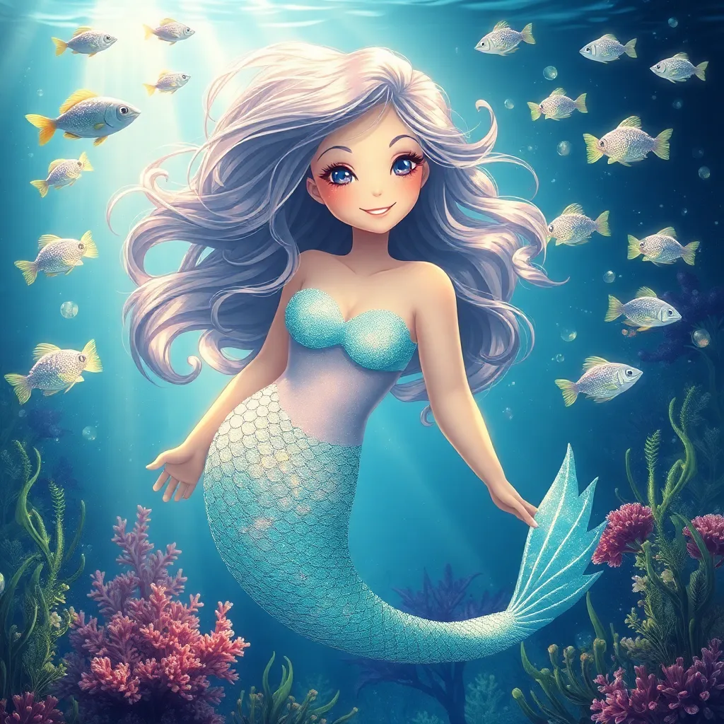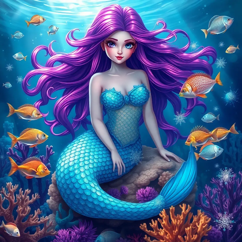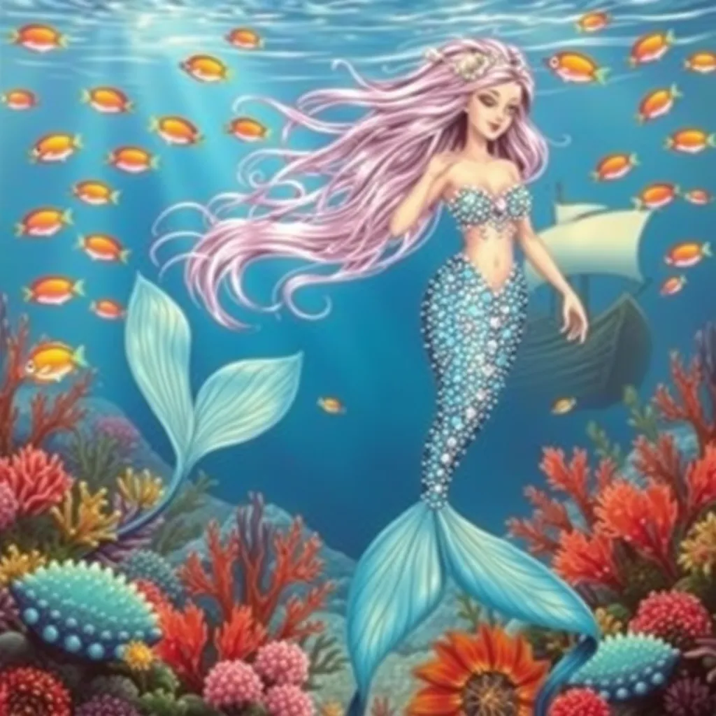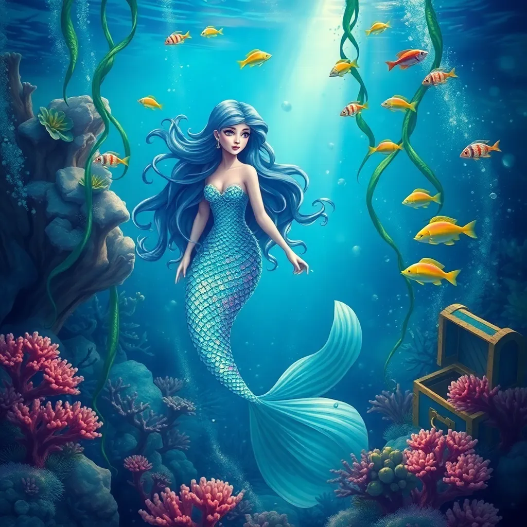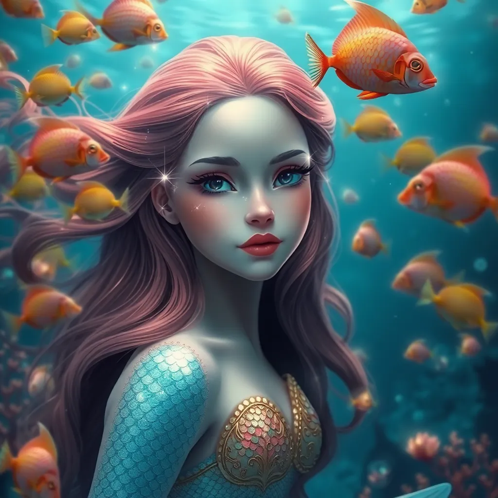 Create an enchanting underwater scene featuring a majestic mermaid with shimmering scales, flowing locks, and a mesmerizing gaze. Surrounded by vibrant sea creatures, she sits atop a coral reef, with a school of sparkling fish swimming in harmony. The atmosphere is whimsical, with a touch of mystique and wonder.
