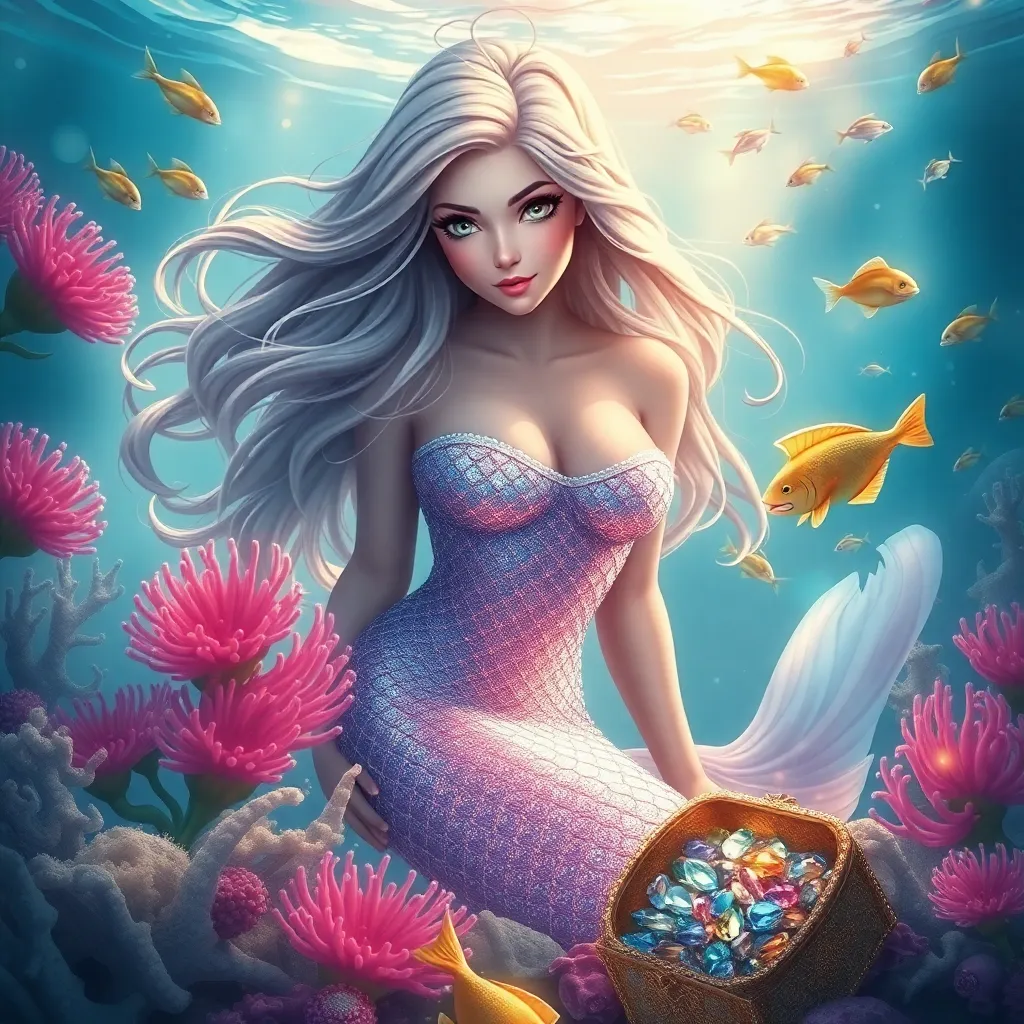 Create an enchanting underwater scene featuring a majestic mermaid with shimmering scales, flowing locks, and a mesmerizing gaze. Surround her with vibrant sea anemones, schools of sparkling fish, and a treasure trove of glittering jewels, all set against a backdrop of iridescent ocean hues and soft, golden lighting.
