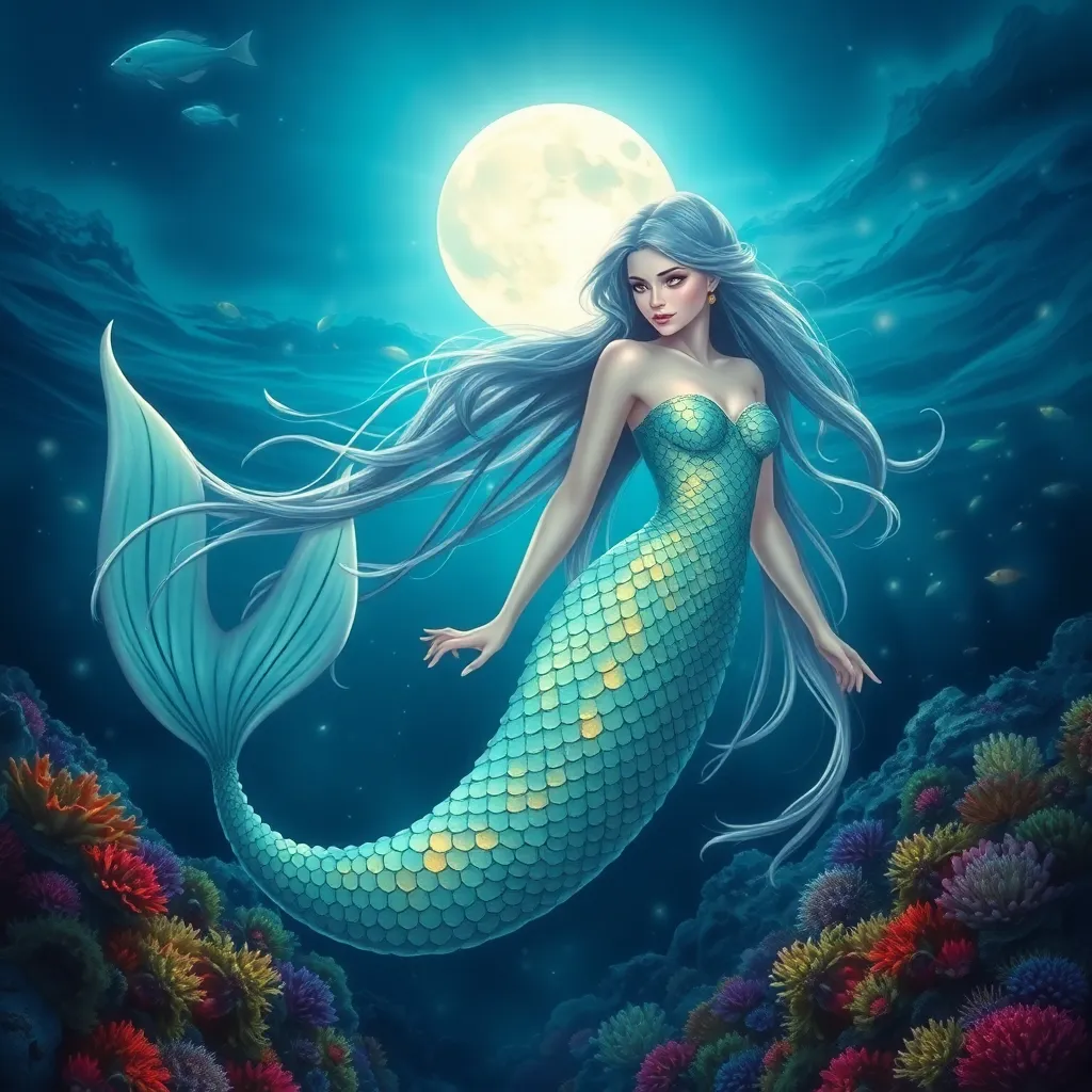 Under the shimmering moonlight, a mystical mermaid emerges from the ocean's depths, her iridescent scales glimmering with an ethereal glow. Her long, flowing hair flows like the seaweed, and her eyes sparkle with an otherworldly wisdom. The coral reef behind her is teeming with colorful marine life.