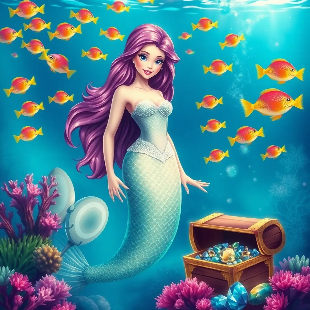 Create an underwater scene featuring a shimmering mermaid, surrounded by a school of rainbow-colored fish and vibrant coral. Incorporate a sunken treasure chest overflowing with glittering jewels and a subtle hint of oceanic mist. The mermaid should have flowing locks and a mesmerizing smile, as if beckoning the viewer to join her underwater world.