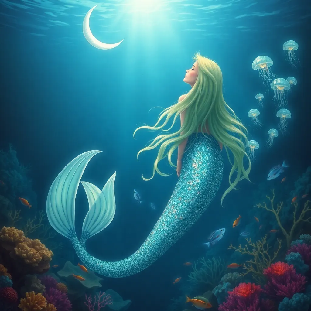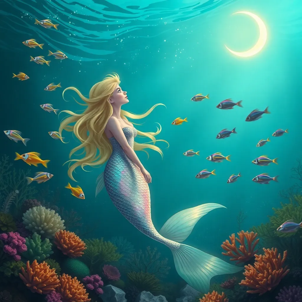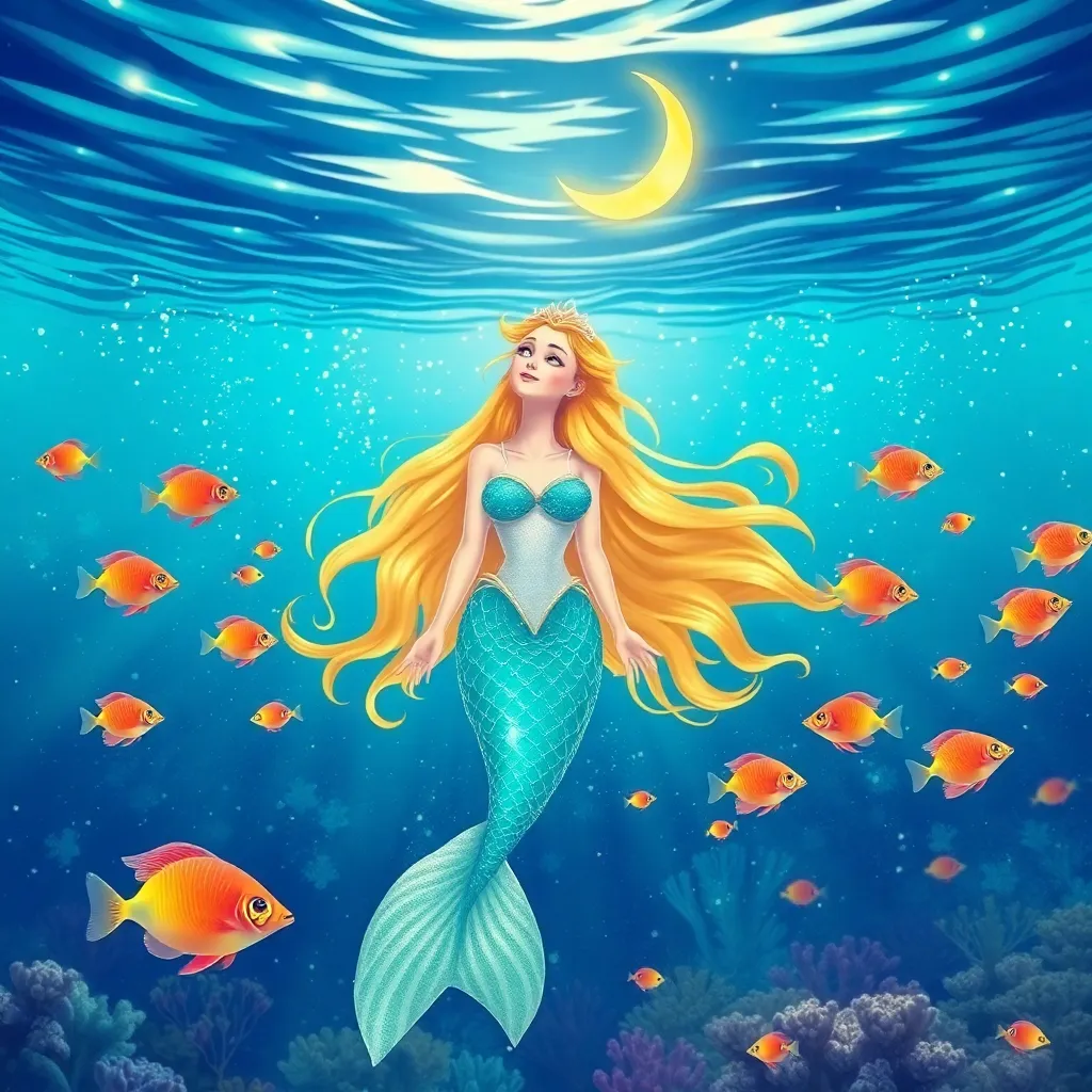Under the sparkling ocean's surface, a majestic mermaid with shimmering turquoise scales and flowing golden locks, surrounded by schools of rainbow-colored fish, gazes up at a crescent moon, her tail shimmering with an ethereal glow. Generate an image that captures this enchanting underwater scene with a whimsical touch.