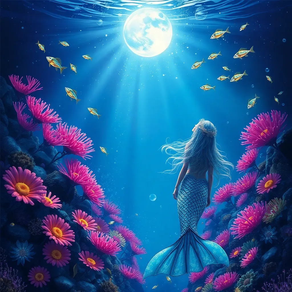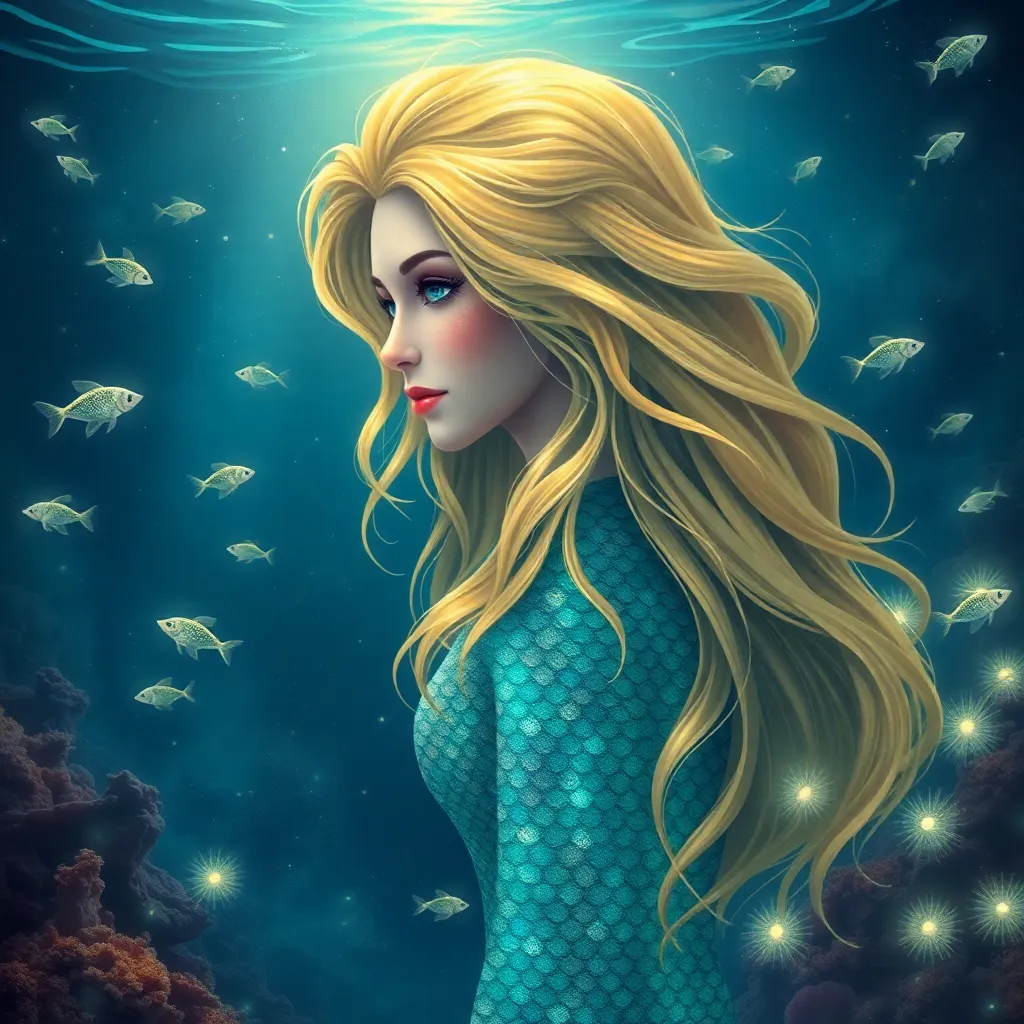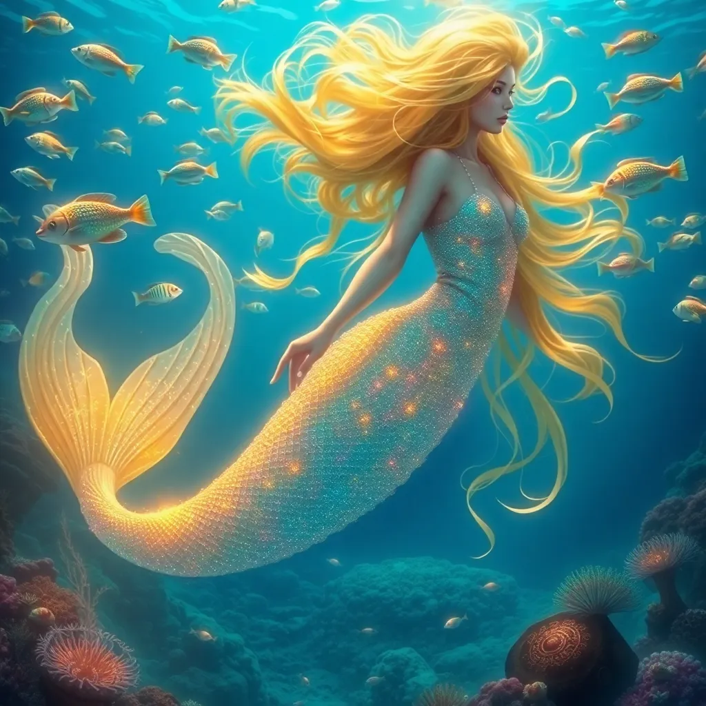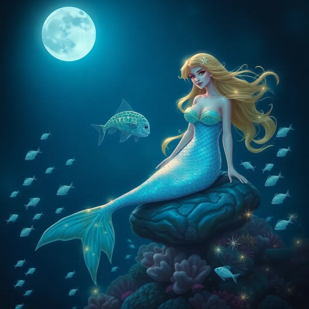 Under the sparkling ocean's surface, a majestic mermaid with shimmering turquoise scales and flowing golden locks, surrounded by schools of rainbow-colored fish, gazes up at a crescent moon, her tail shimmering with an ethereal glow. Generate an image that captures this enchanting underwater scene with a whimsical touch.