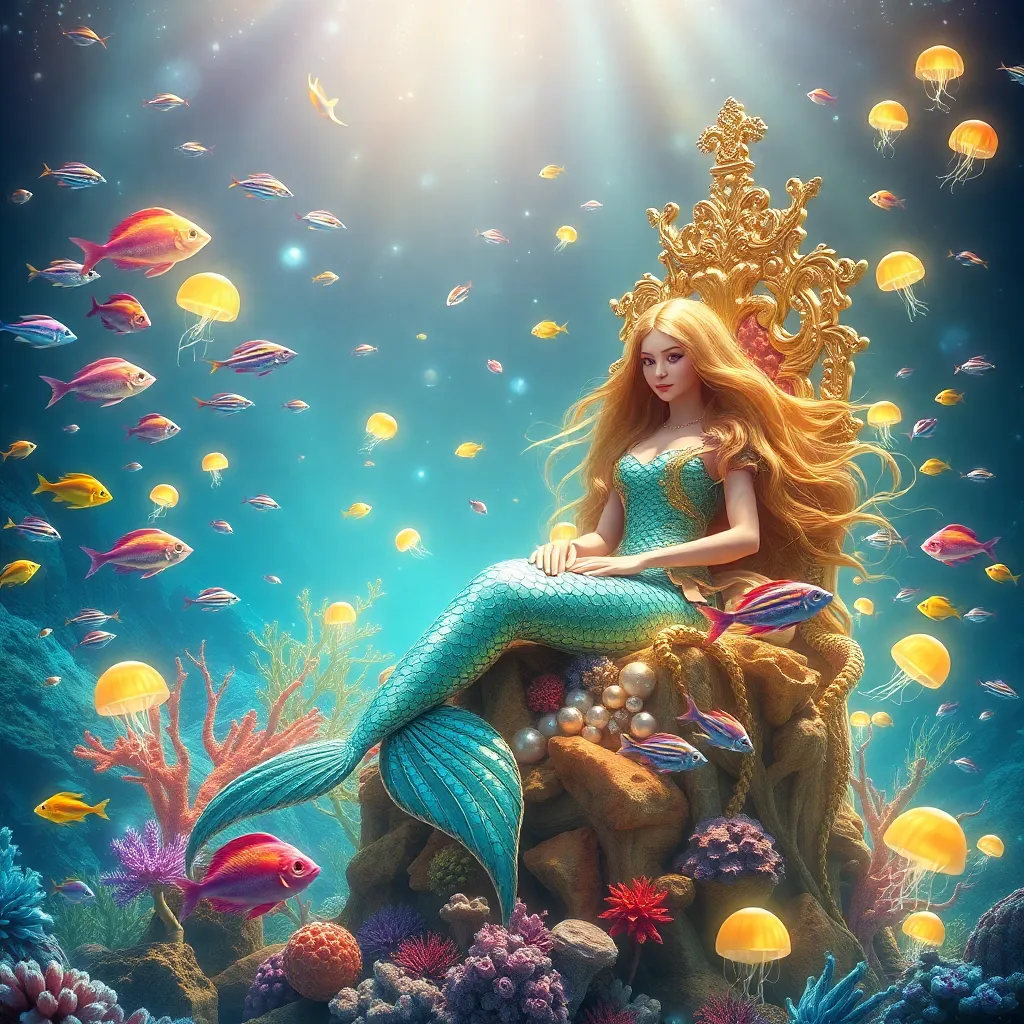 Imagine a mystical underwater kingdom where mermaids and sea creatures coexist in harmony. A shimmering mermaid with iridescent scales and flowing locks of golden hair sits on a throne made of coral and pearls, surrounded by schools of rainbow fish and glowing jellyfish. Generate an AI image that captures this enchanting scene.