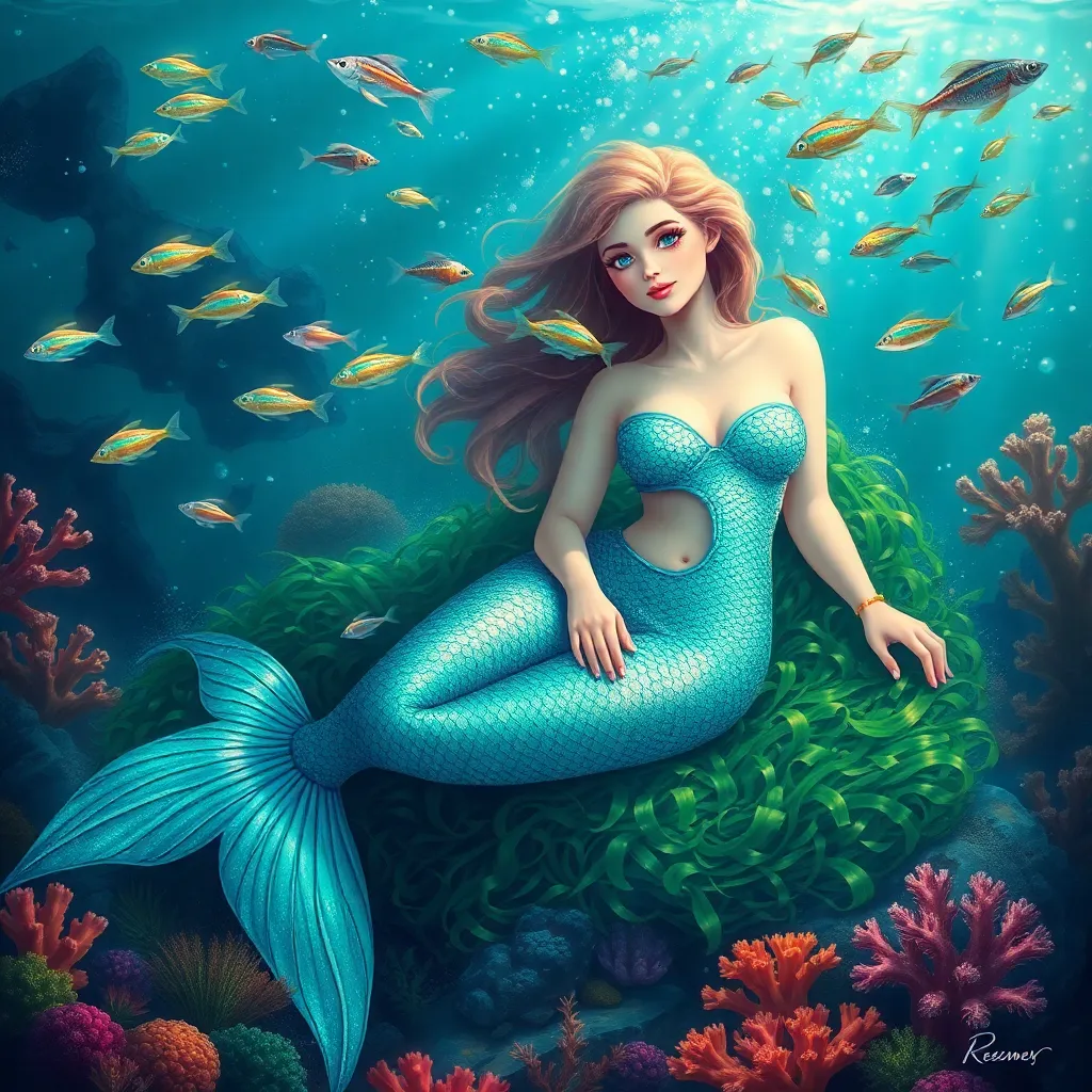 Create an enchanting underwater scene with a mermaid lounging on a bed of seaweed, surrounded by schools of glittering fish and colorful coral. Incorporate shimmering scales, flowing locks, and a radiant tail that shimmers in shades of turquoise and emerald. Capture the mystical essence of the ocean's depths.