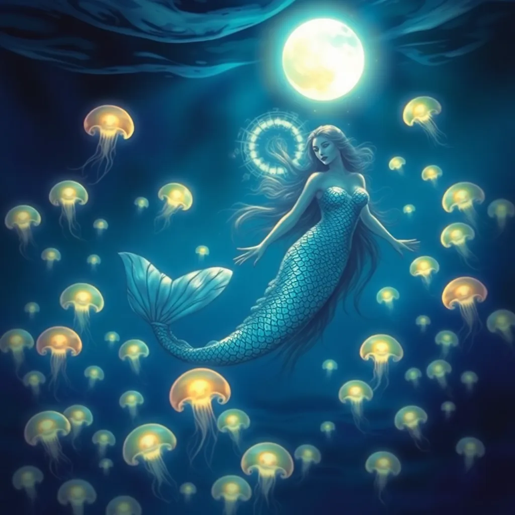 Under the moonlit ocean, a mystical mermaid swims amidst a school of glowing jellyfish, her shimmering scales catching the light. She's surrounded by a halo of iridescent mist, her long hair flowing like seaweed. The background is a gradient of blues and purples, evoking the mystery of the deep sea.