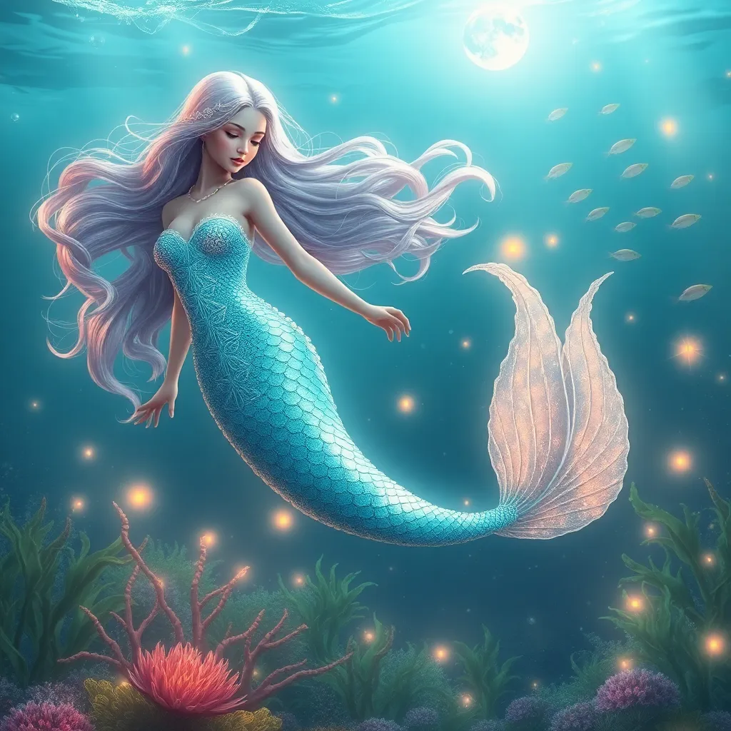 Create an enchanting mermaid image with shimmering scales, flowing locks, and a whimsical tail. Imagine a mystical underwater realm with glowing seaweed, schools of rainbow fish, and a hint of moonlight filtering through the waves. Incorporate AI-generated textures and colors to bring this ethereal world to life.