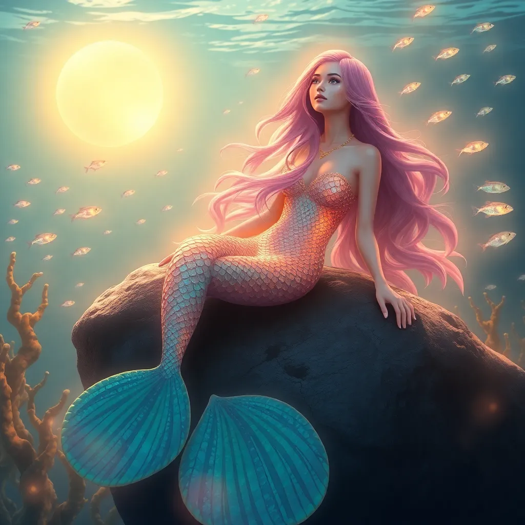 Create an AI-generated image of a mystical mermaid lounging on a sun-kissed rock, surrounded by glowing seaweed and schools of iridescent fish. Her shimmering scales reflect the colors of the ocean, and her long, flowing hair flows like the currents. Incorporate subtle glows and textures to give the image an ethereal ambiance.
