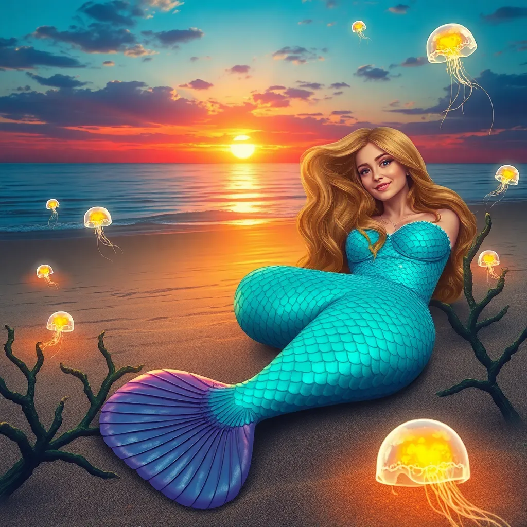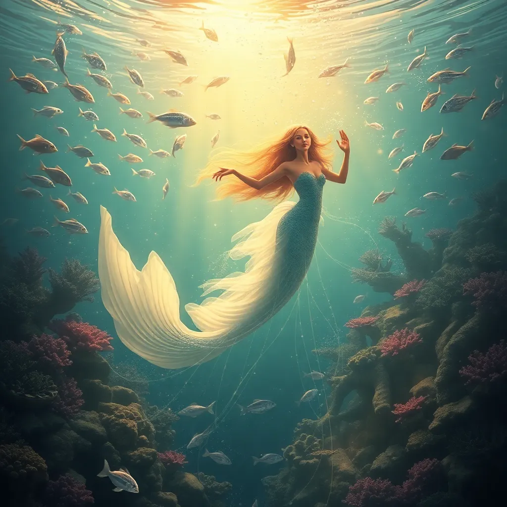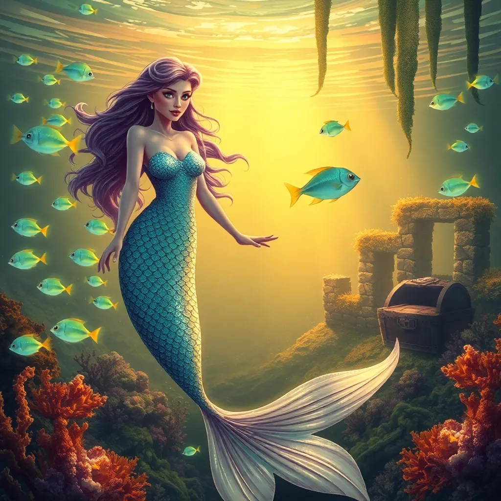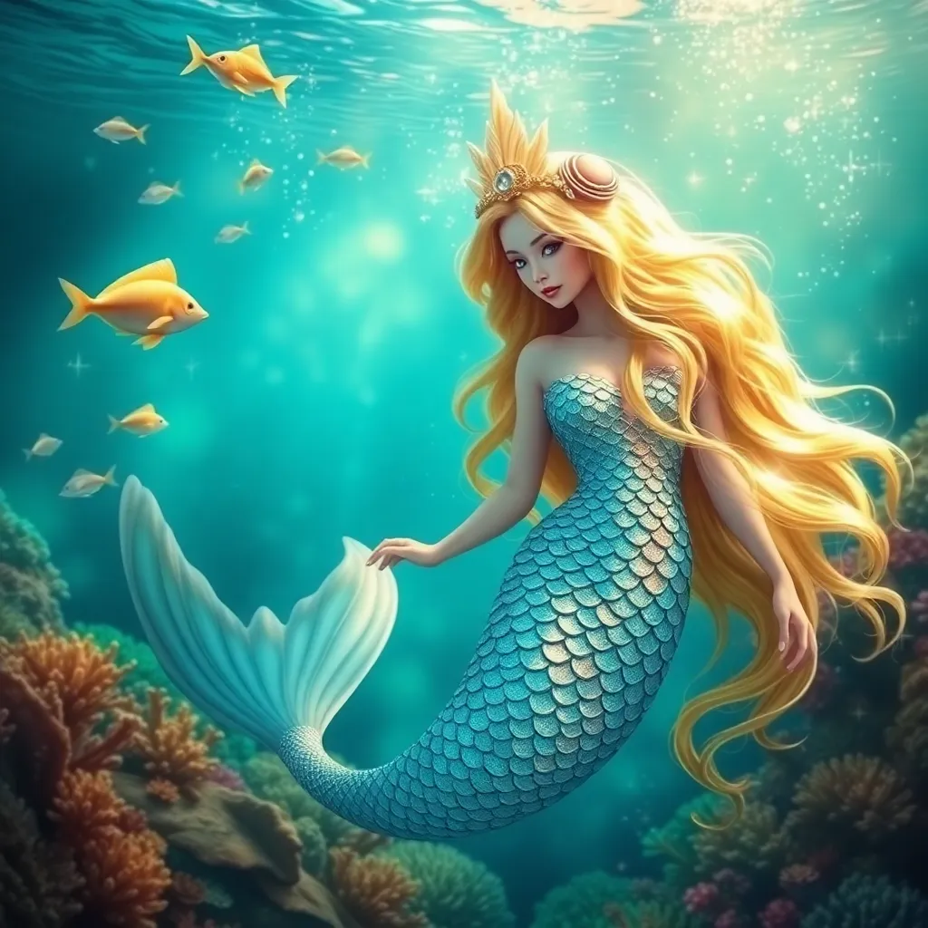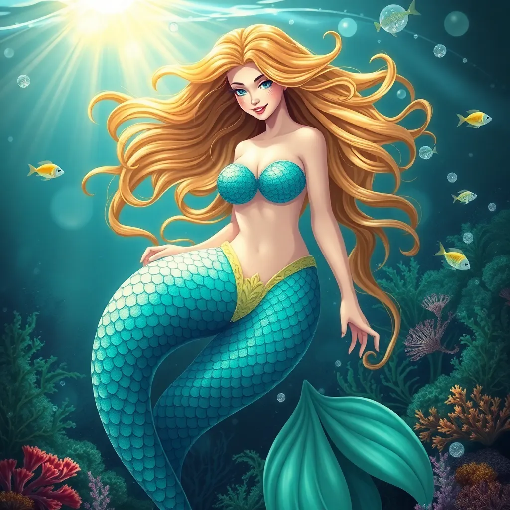 Imagine a majestic mermaid, with shimmering scales in shades of turquoise and emerald, flowing locks of golden hair, and a radiant smile. She's surrounded by a lush underwater garden, with coral, seaweed, and schools of sparkling fish. The light of the sun filtering down from above casts a warm glow.