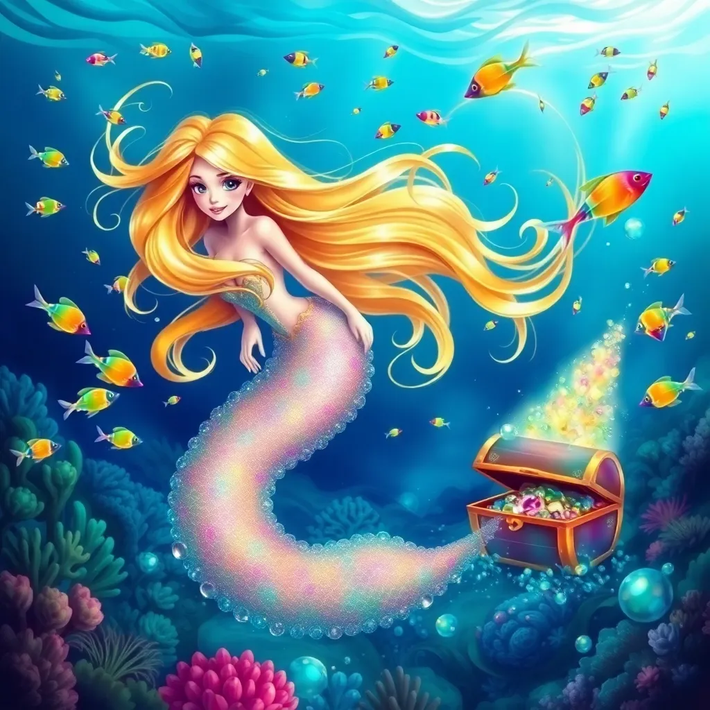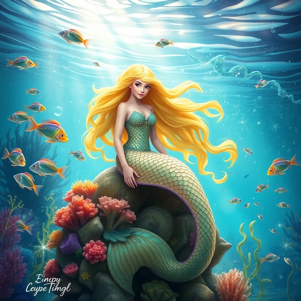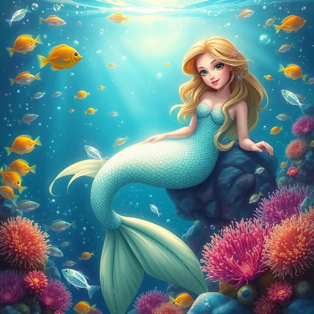 Imagine a whimsical underwater scene where a majestic mermaid with shimmering scales and flowing locks of golden hair is perched on a coral reef, surrounded by schools of rainbow-colored fish and sparkling seaweed, with a faint glow of sunlight filtering through the waves, creating a magical atmosphere.