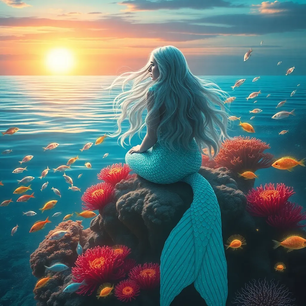 Imagine a mystical underwater kingdom, where a shimmering mermaid sits atop a coral throne, surrounded by schools of iridescent fish and glowing sea anemones. Her long, flowing locks flow like seaweed in the gentle current, as she gazes out at a sunset-kissed ocean horizon. Create an enchanting AI image.