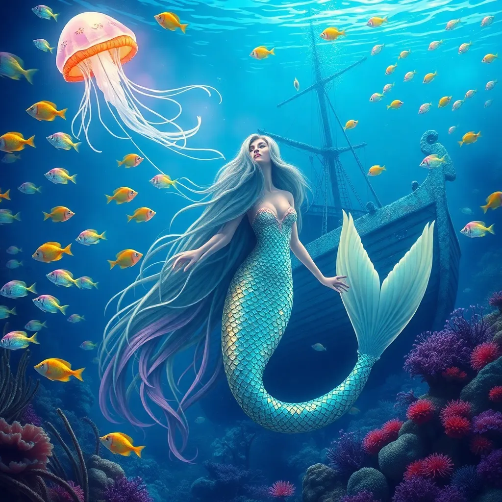 Create an underwater scene where a mermaid is surrounded by schools of rainbow-colored fish, with a glowing jellyfish hovering above her head. The mermaid's long hair flows like seaweed, and her shimmering tail sparkles with iridescent scales. Incorporate a sunken ship in the background, covered in coral and sea anemones.