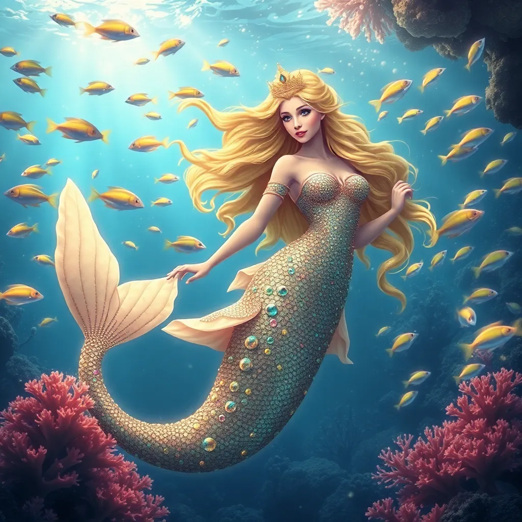 Underwater kingdom's enchanting princess, surrounded by schools of shimmering fish and coral, with a shimmering tail and flowing locks of golden hair. Create an AI-generated image of a mesmerizing mermaid, blending mythical beauty with oceanic wonder, evoking a sense of ethereal tranquility and awe-inspiring majesty.