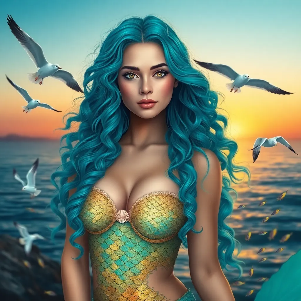 Create an enchanting mermaid portrait, set against a warm sunset backdrop, with shimmering scales in shades of turquoise and gold, flowing locks of long, curly hair, and a delicate seashell bra, surrounded by oceanic creatures like seagulls and schools of fish, conveying a sense of mystical freedom.