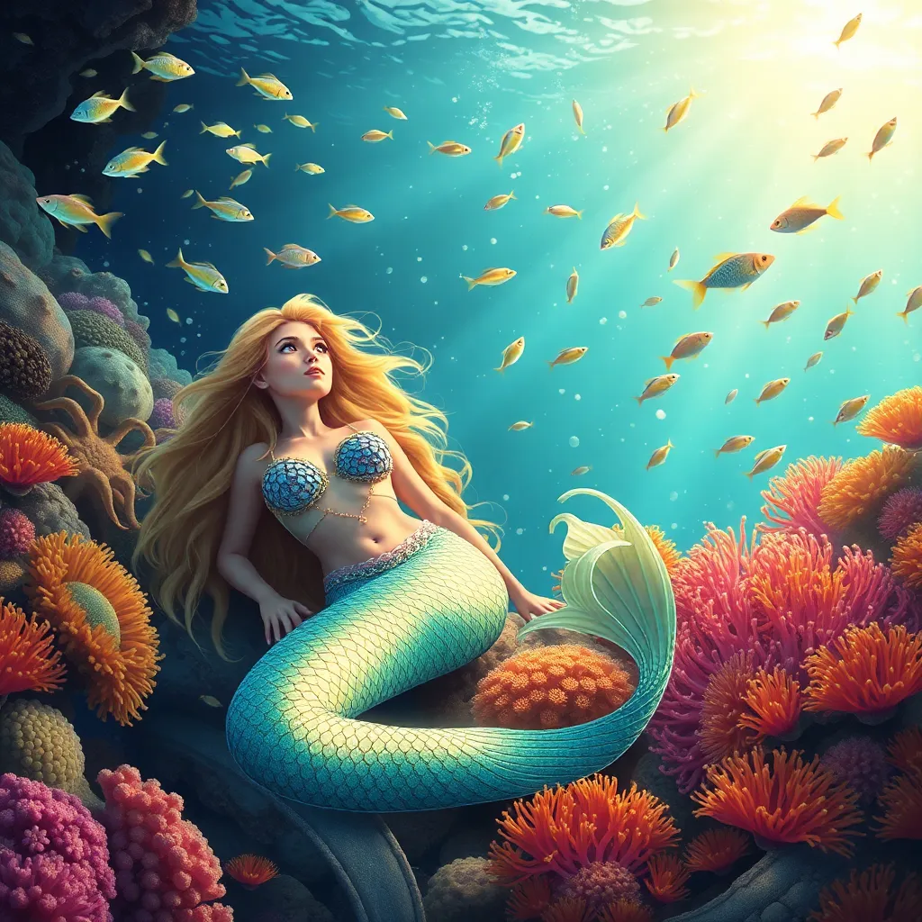 Create an enchanting underwater scene featuring a mermaid lounging on a coral reef, surrounded by schools of shimmering fish and colorful sea anemones. Incorporate iridescent scales and flowing locks of golden hair. The mermaid should be gazing upwards, with a dreamy expression, as if mesmerized by the sunlight above.