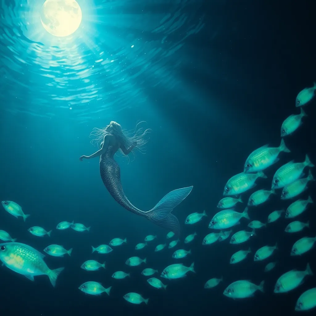 Under the radiant moonlight, a mystical mermaid emerges from the depths of the ocean, her shimmering scales catching the light. She's surrounded by a school of bioluminescent fish, their glow illuminating the dark waters. Capture the ethereal beauty of this underwater scene, with a hint of magic and wonder.