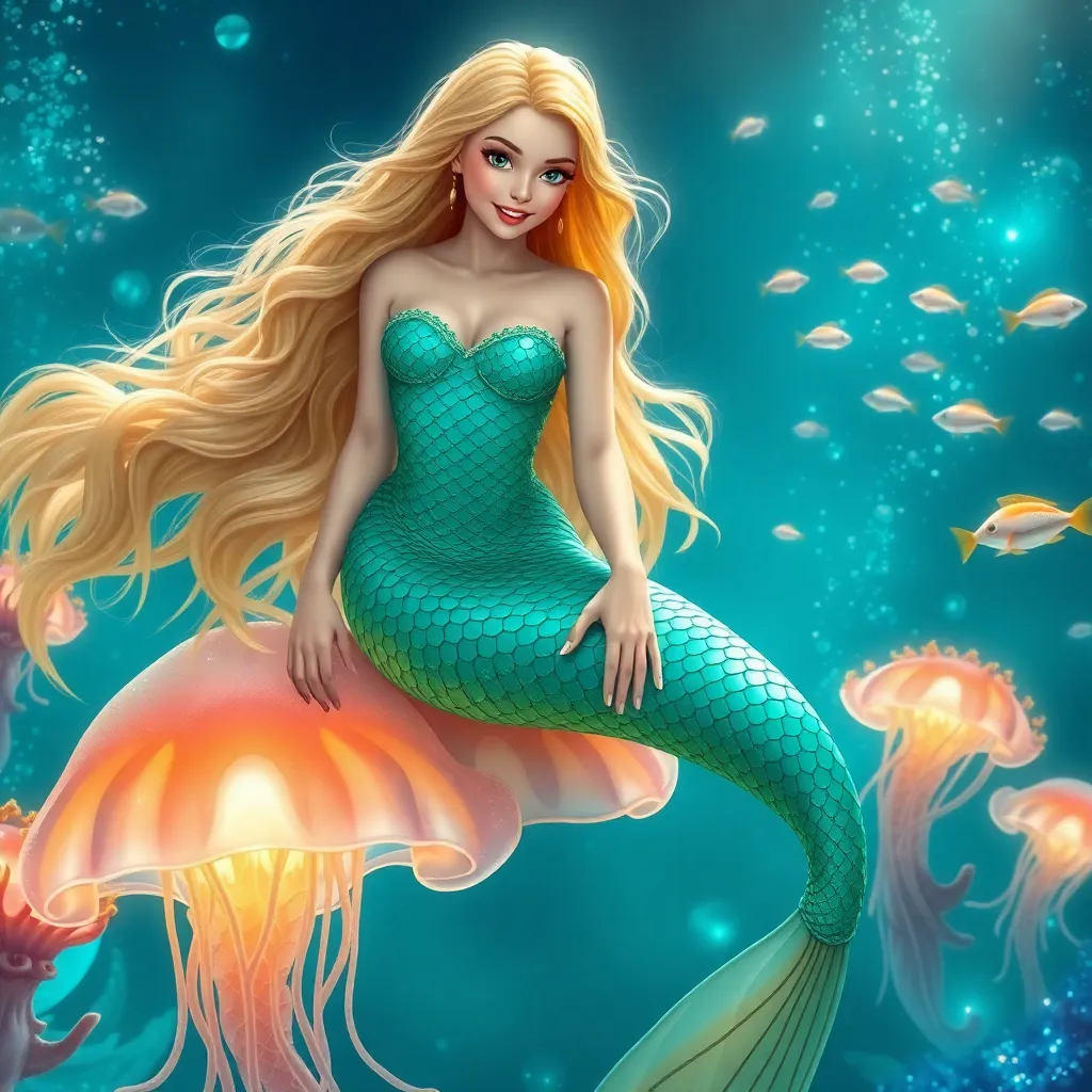 Create a stunning underwater scene featuring a majestic mermaid with shimmering turquoise scales, flowing golden locks, and a mesmerizing smile. She's perched on a glowing jellyfish, surrounded by vibrant sea anemones and schools of sparkling fish. Incorporate iridescent colors and ethereal lighting to capture the magic of the ocean.