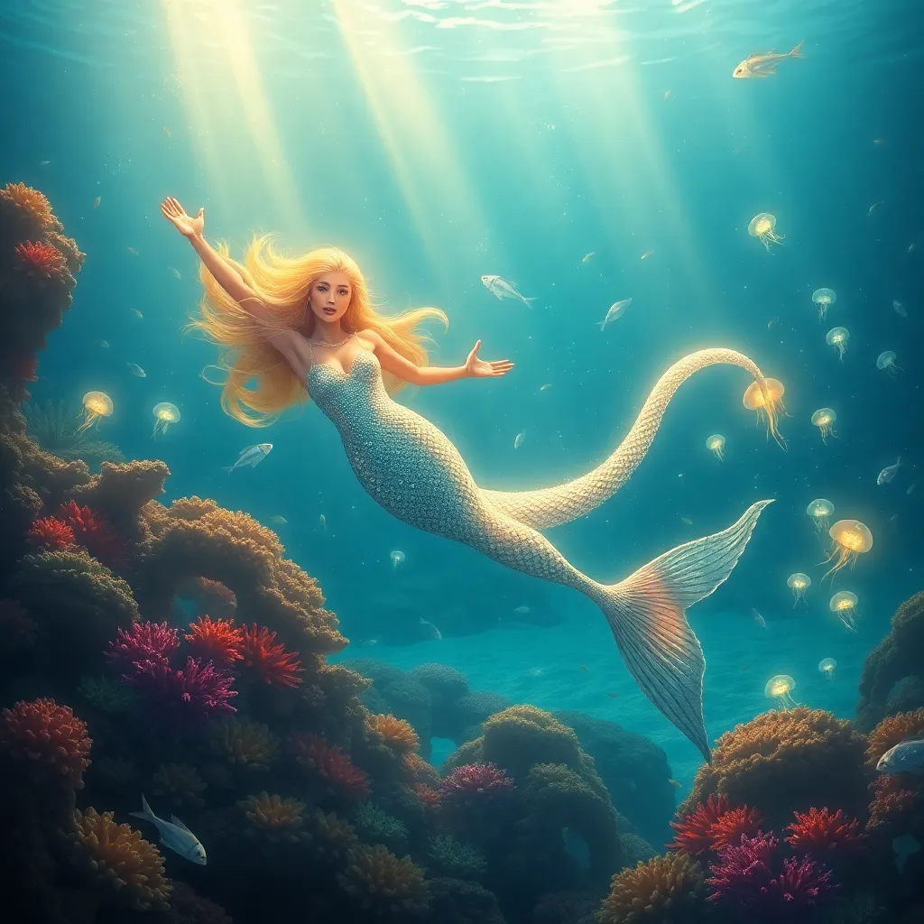 Imagine a mystical underwater kingdom, where a shimmering mermaid with iridescent scales and flowing locks of golden hair glides effortlessly through the coral reef, surrounded by schools of sparkling fish and bioluminescent jellyfish, as the sunlight filters down from above, casting a warm glow on the tranquil ocean floor.