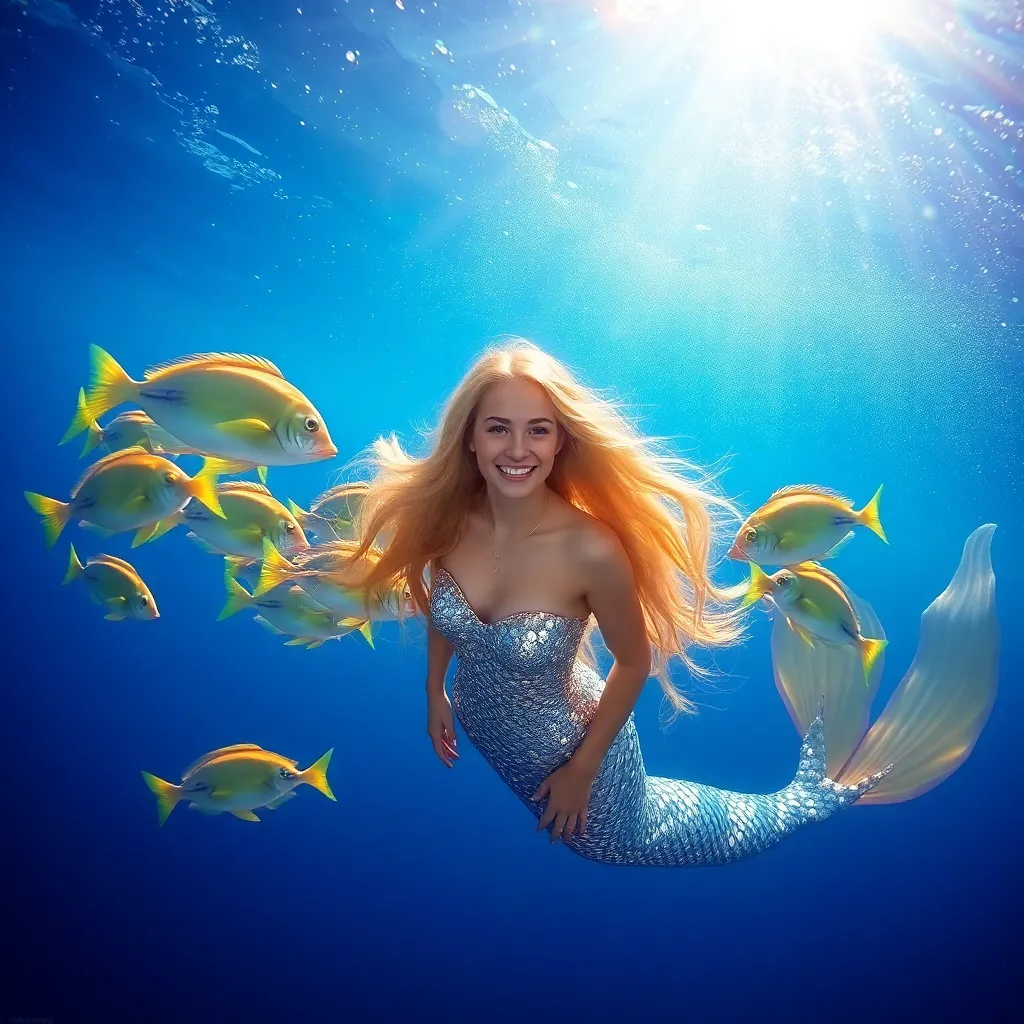 Create an enchanting underwater scene featuring a mermaid with shimmering scales, flowing locks, and a mesmerizing smile. She's surrounded by a school of glittering fish, coral, and seaweed, with a hint of sunlight filtering down from above. Incorporate iridescent colors and soft, dreamy lighting to evoke a sense of wonder.