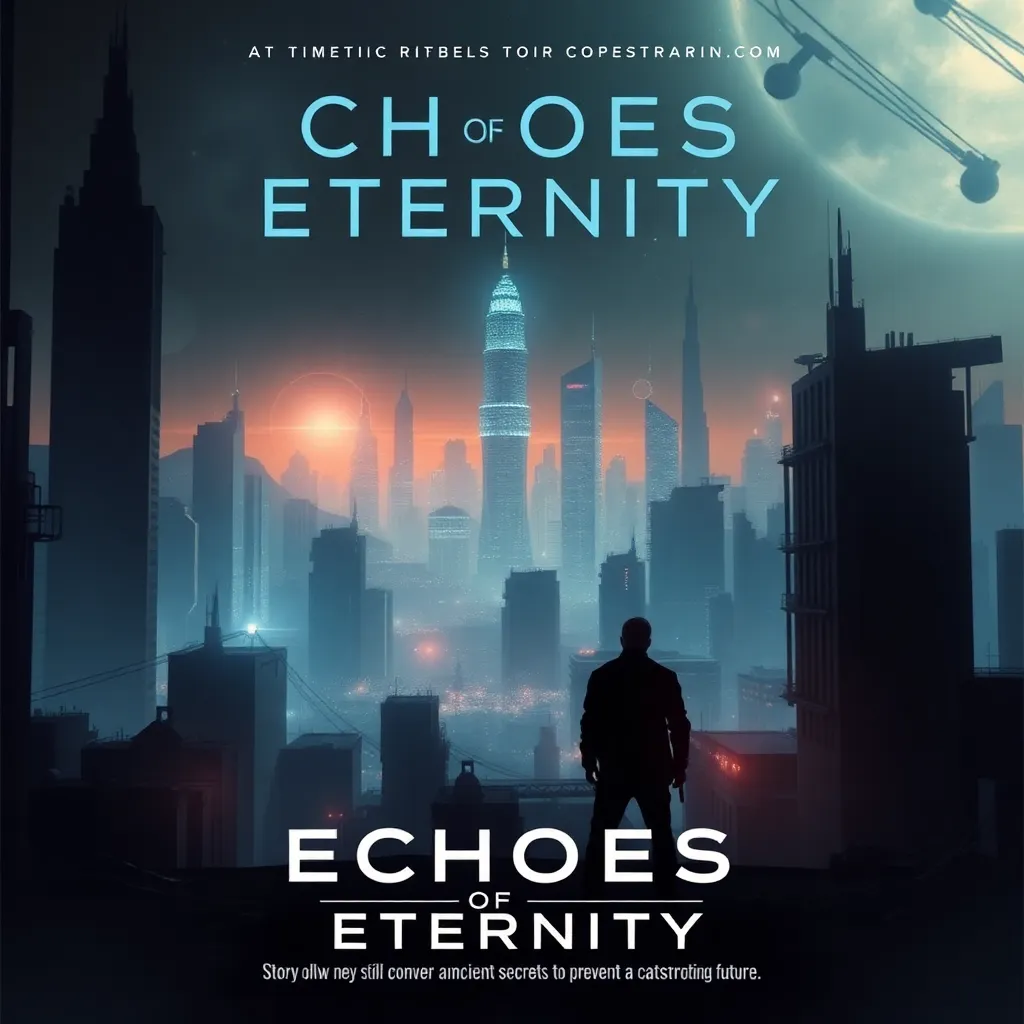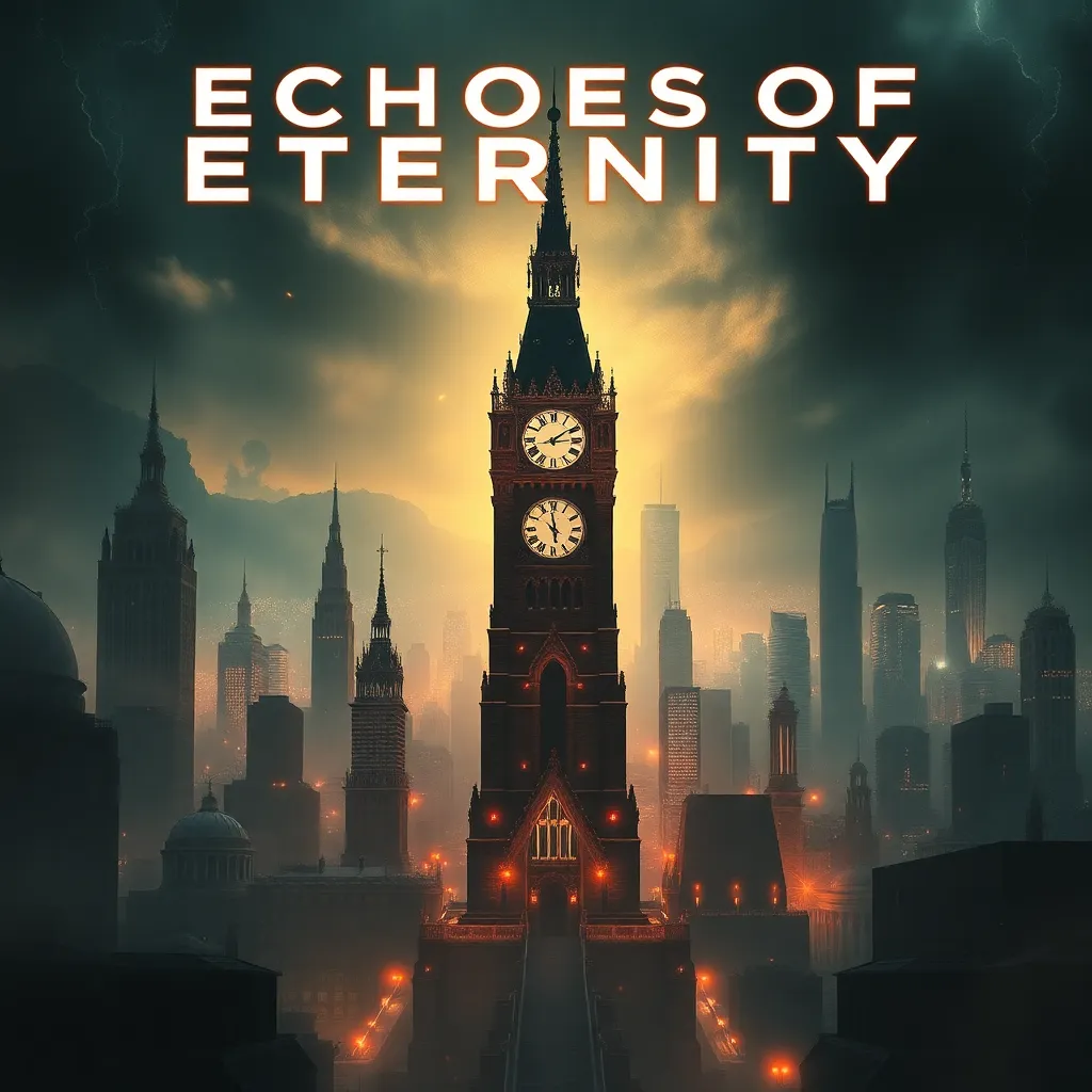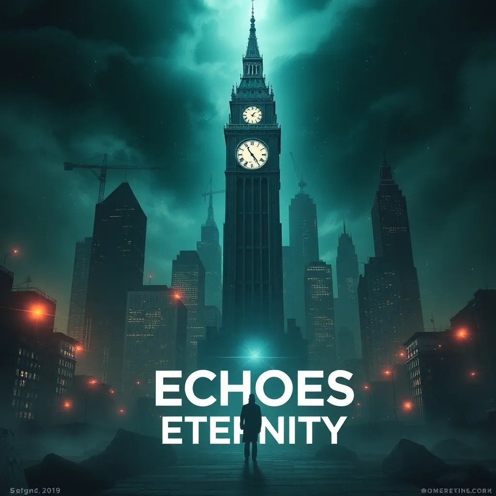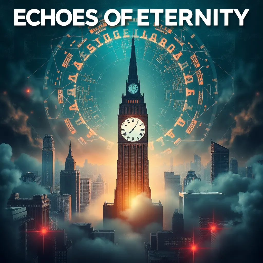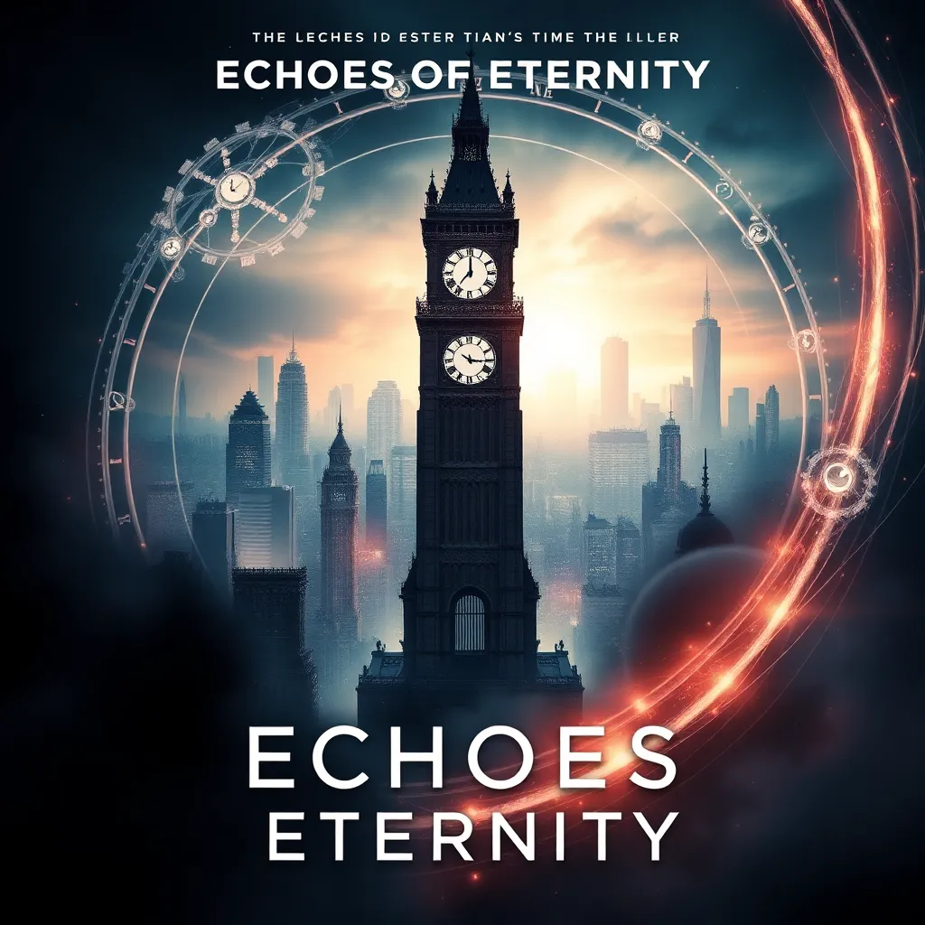 Create a movie poster for a futuristic sci-fi thriller titled 'Echoes of Eternity.' The story follows a team of scientists who discover a way to communicate with their past selves, but soon find themselves trapped in a time loop. The poster should feature a haunting cityscape with a glowing clock tower at its center.