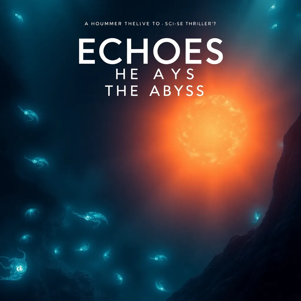 Create a movie poster for a sci-fi thriller titled 'Echoes in the Abyss'. The story follows a team of deep-sea explorers who uncover an ancient alien city, but soon discover they are not alone. The poster should feature a hauntingly beautiful underwater landscape with eerie bioluminescent creatures lurking in the shadows.