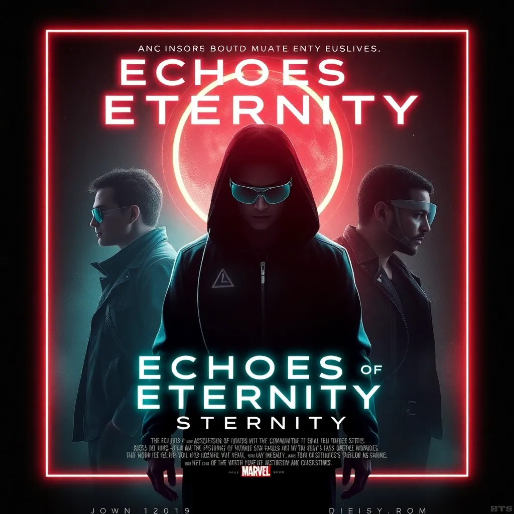 Create a movie poster for a futuristic sci-fi thriller called 'Echoes of Eternity'. The story follows a group of scientists who discover a way to communicate with their past selves, but soon realize that altering the timeline has catastrophic consequences. The poster should feature a dark, gritty aesthetic with neon lights and a sense of urgency.