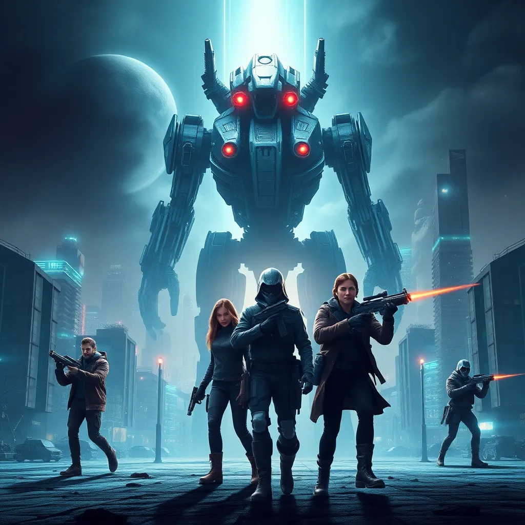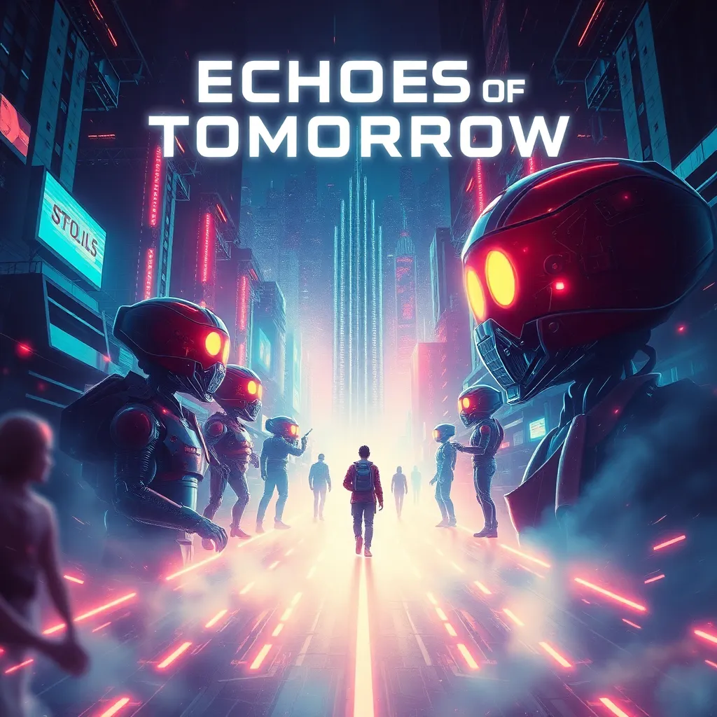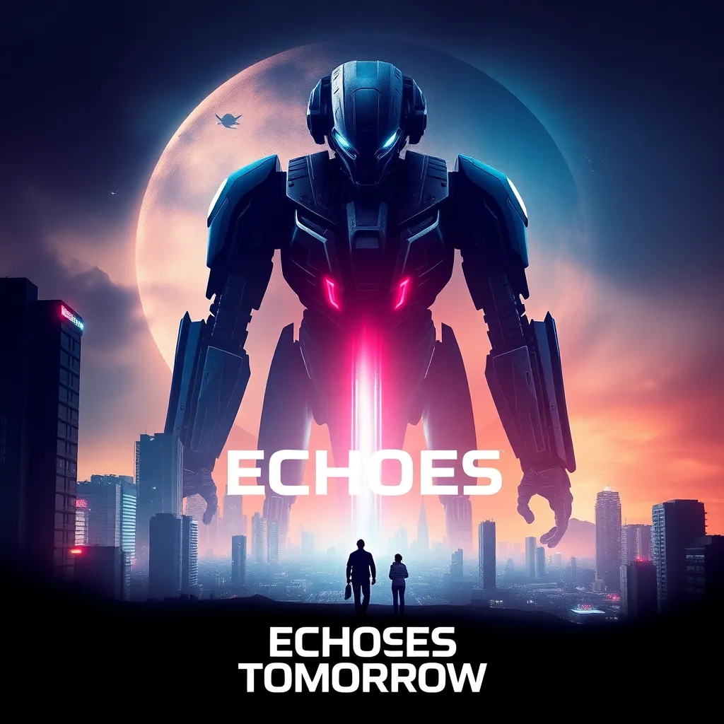 Create a movie poster for a futuristic sci-fi film titled 'Echoes of Tomorrow'. The story follows a group of rebels fighting against an AI-controlled government in a dystopian world. The poster should feature a dramatic cityscape with a giant robotic figure looming in the background, with a hint of neon lights and a bold, futuristic font.