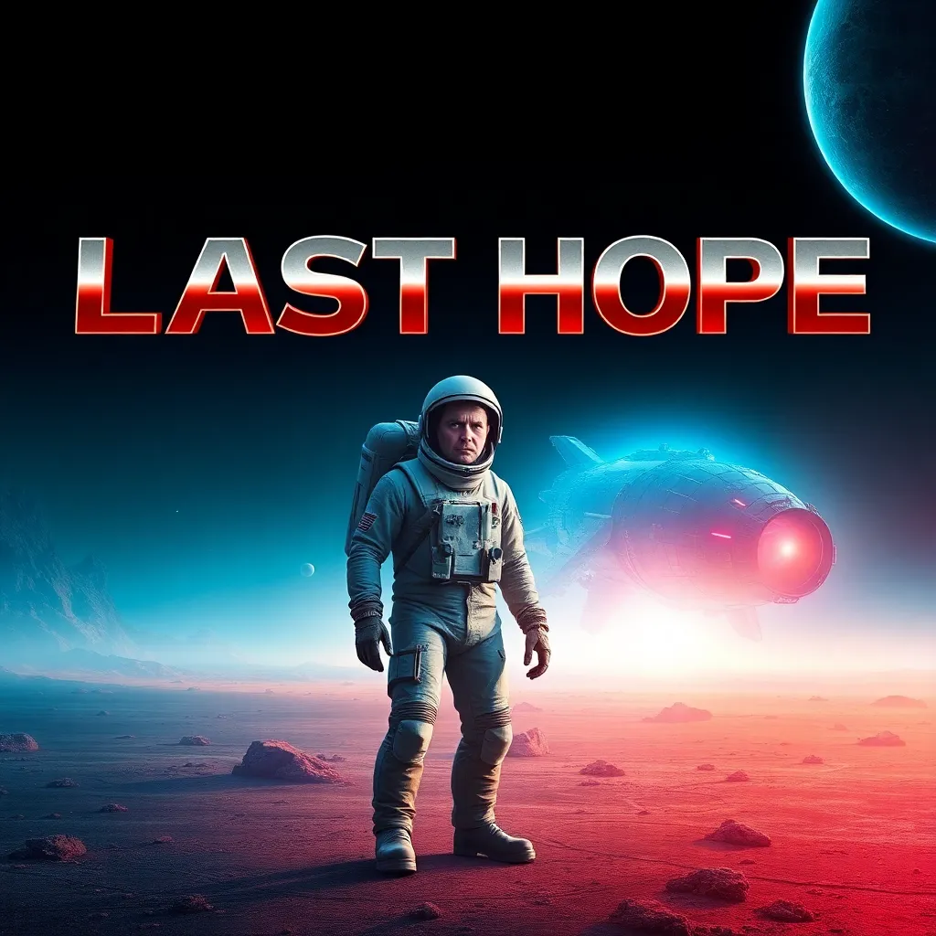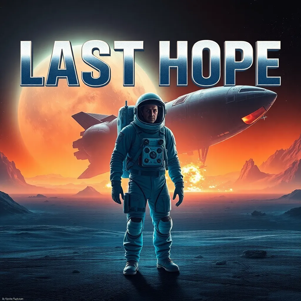 Create a futuristic sci-fi movie poster featuring a lone astronaut standing on a desolate, neon-lit planet with a massive spaceship crashing in the background. The astronaut is wearing a worn-out spacesuit and has a determined look on their face. The title 'Last Hope' is emblazoned in bold, metallic letters across the top.