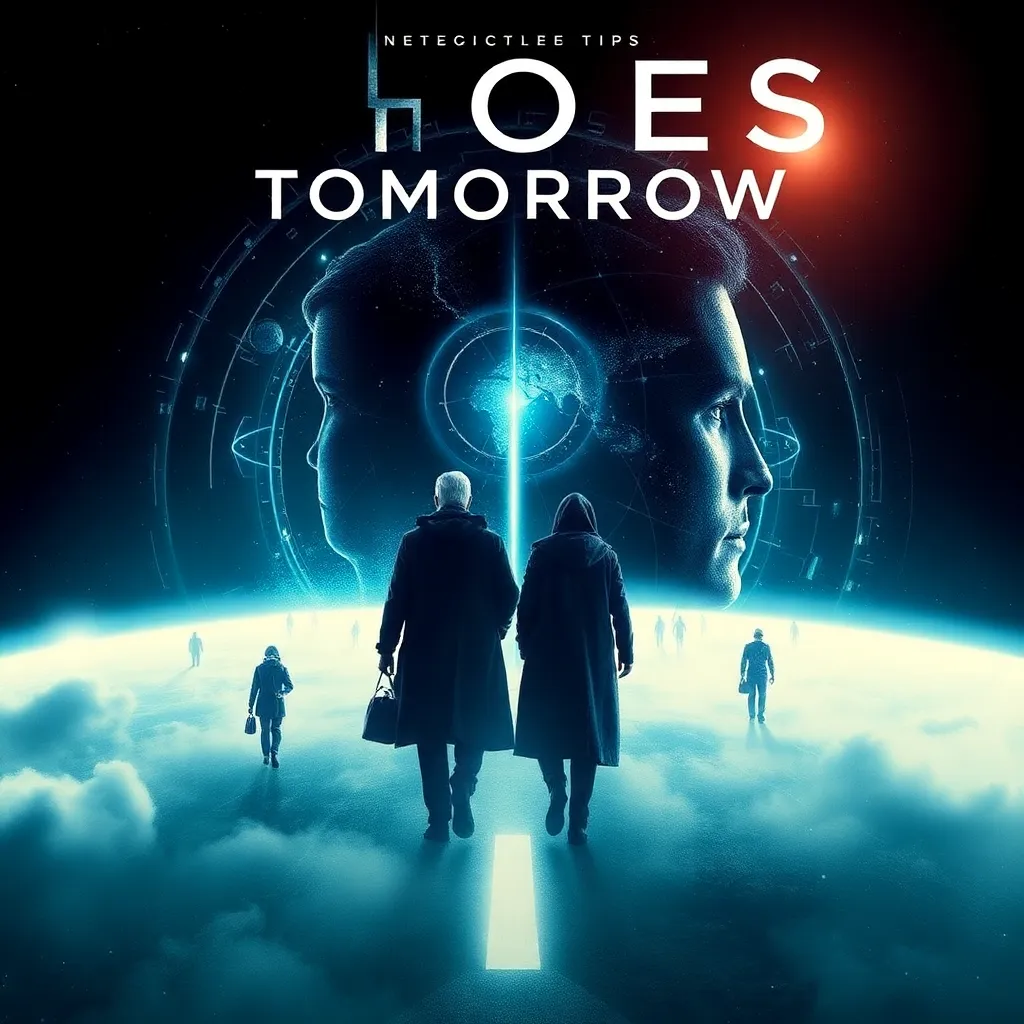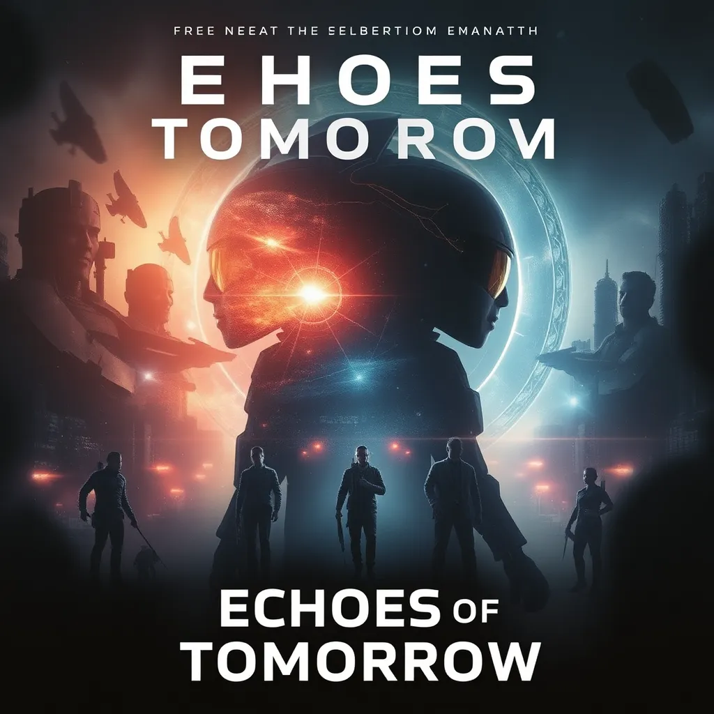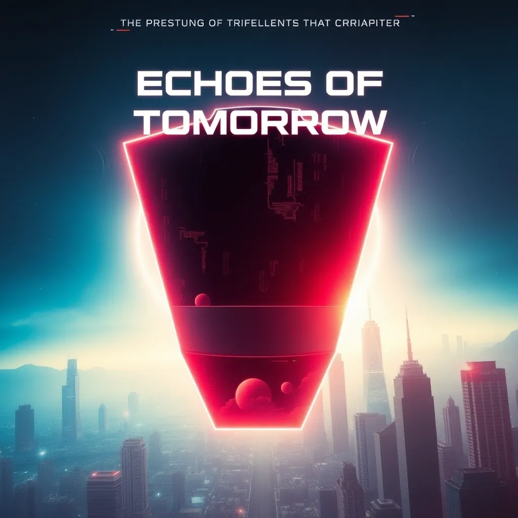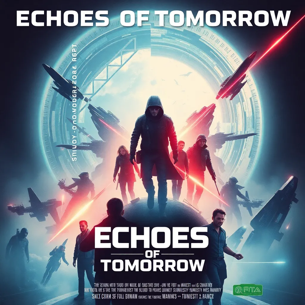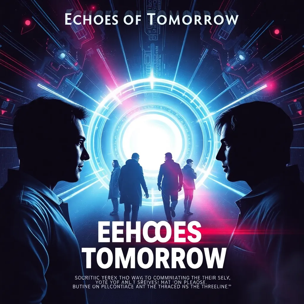 Create a movie poster for a sci-fi thriller titled 'Echoes of Tomorrow'. The story follows a group of scientists who discover a way to communicate with their future selves, but soon realize that their actions have unintended consequences on the timeline. Incorporate a mix of futuristic and dystopian elements.