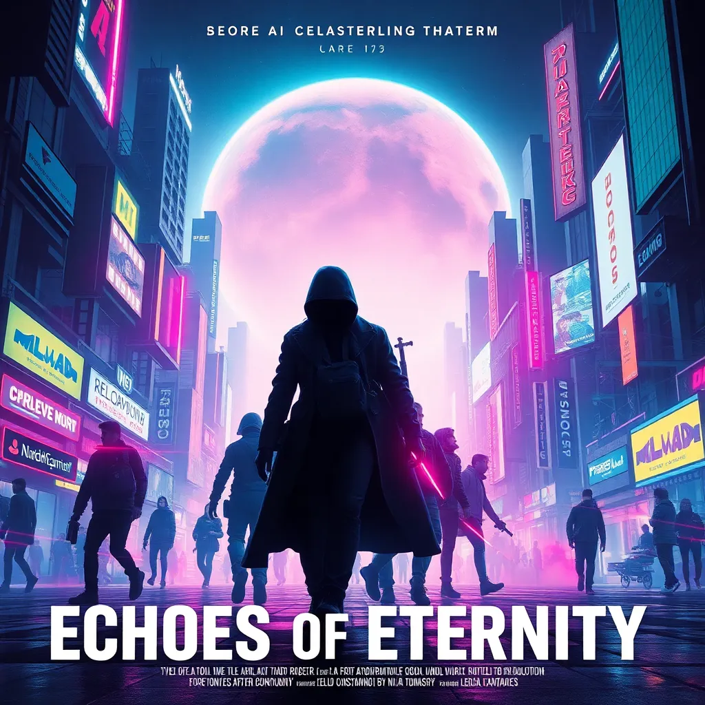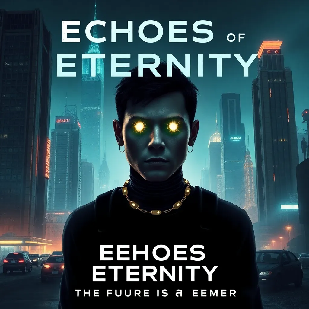 Generate a movie poster for a futuristic sci-fi thriller titled 'Echoes of Eternity' set in a dystopian city, featuring a lone protagonist with cybernetic enhancements, surrounded by neon-lit skyscrapers and a cityscape in ruins, with a haunting glow emanating from their eyes, and a tagline 'The Future is a Memory'.