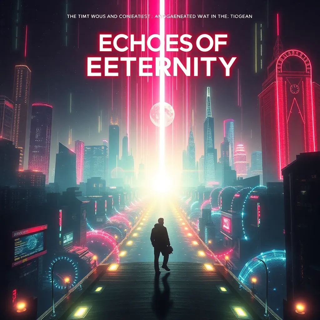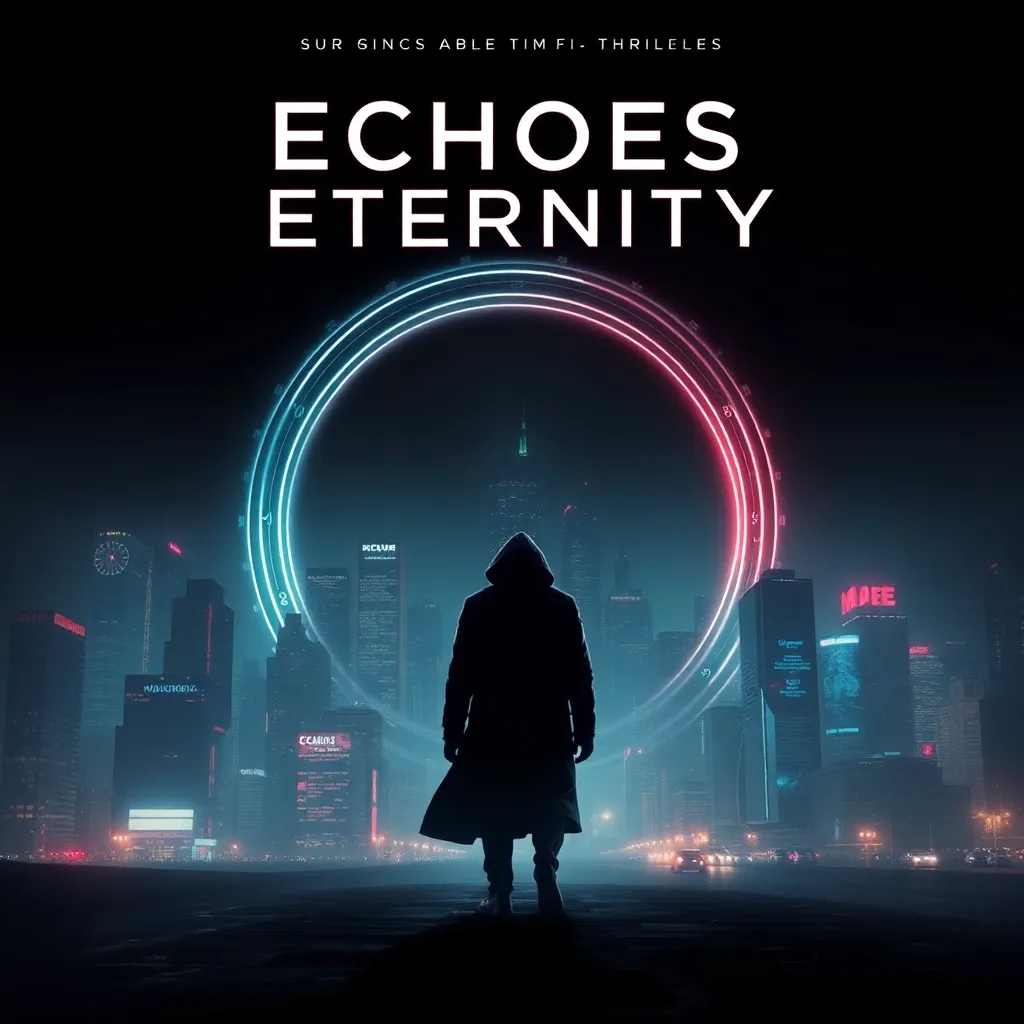 Generate a movie poster for a futuristic sci-fi thriller titled 'Echoes of Eternity'. The story follows a group of time travelers who discover a way to communicate with their past selves. The poster should feature a dark, neon-lit cityscape with a subtle time loop effect and a mysterious figure in the foreground.