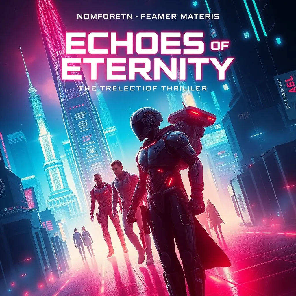 Create a futuristic sci-fi movie poster for a film titled 'Echoes of Eternity.' The story follows a team of scientists who discover a way to communicate with their past selves, but their actions have unintended consequences on the timeline. The poster should feature a blend of neon-lit cityscapes and eerie time distortions.