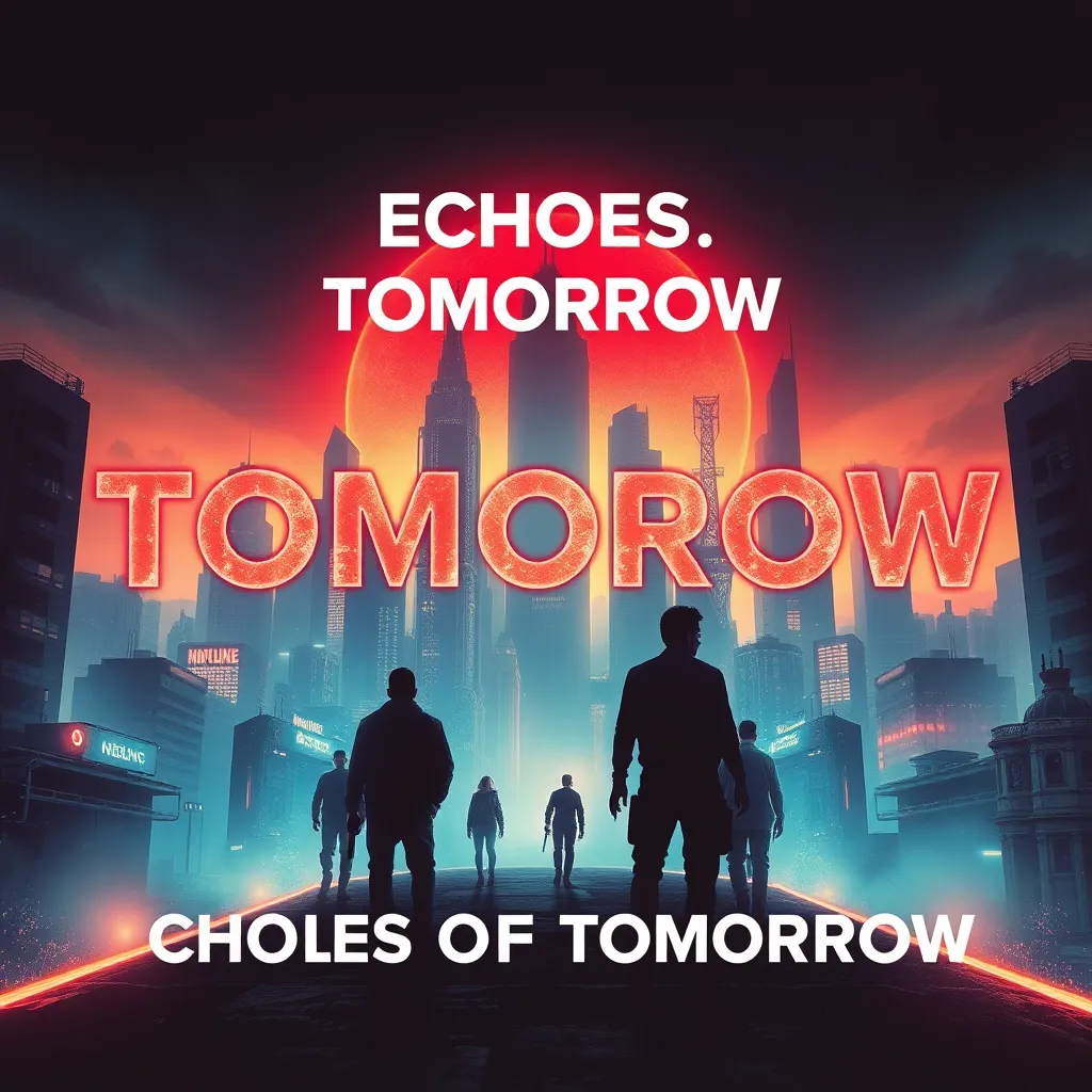 Generate a futuristic movie poster for a sci-fi thriller called 'Echoes of Tomorrow'. The story follows a team of scientists who discover a way to communicate with their past selves, but soon realize that altering the timeline has catastrophic consequences. The poster should feature a cityscape with a bold, neon-lit color scheme and a sense of urgency.