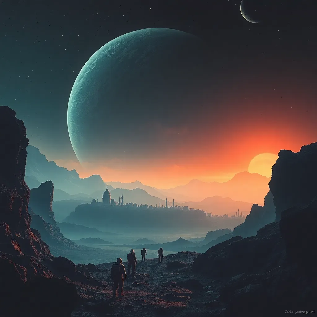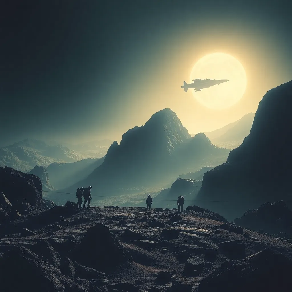 Create a movie poster for a sci-fi thriller about a group of astronauts who discover a mysterious alien signal on a distant planet. The poster should feature a hauntingly beautiful image of the planet's rugged landscape, with a spaceship looming in the distance and a subtle hint of an alien presence.