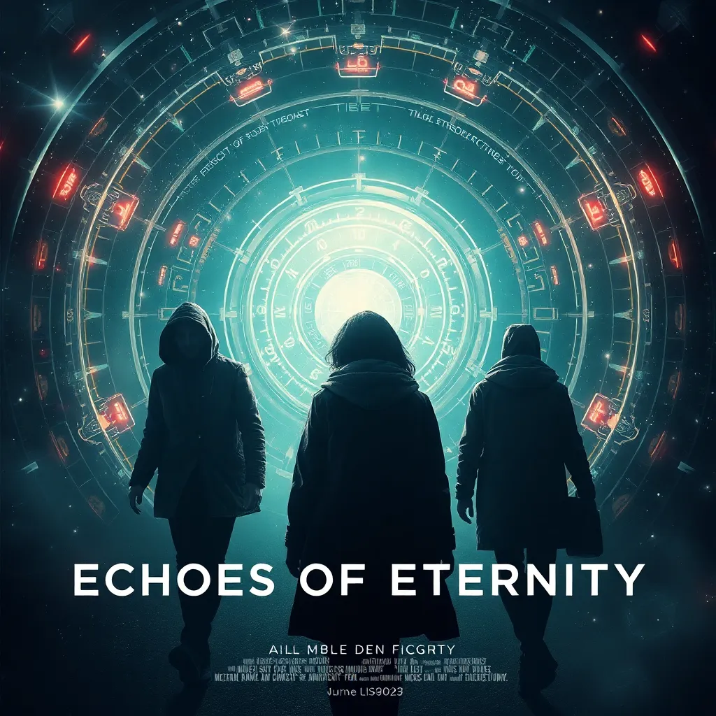 Create a movie poster for a futuristic sci-fi thriller titled 'Echoes of Eternity'. The story follows a group of time travelers who discover a way to communicate with their past selves, but soon find themselves trapped in a never-ending cycle of reliving the same memories. Generate an image that captures the sense of timelessness and urgency.