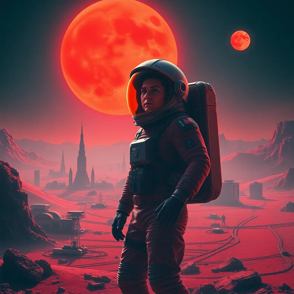 Create a futuristic sci-fi movie poster featuring a lone astronaut standing on a desolate, Martian landscape at sunset. The astronaut is dressed in a worn, silver spacesuit with a hint of a smile. The background is a deep, crimson red with a faint, glowing horizon. The title font is bold and neon green.
