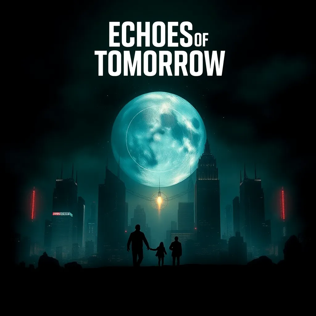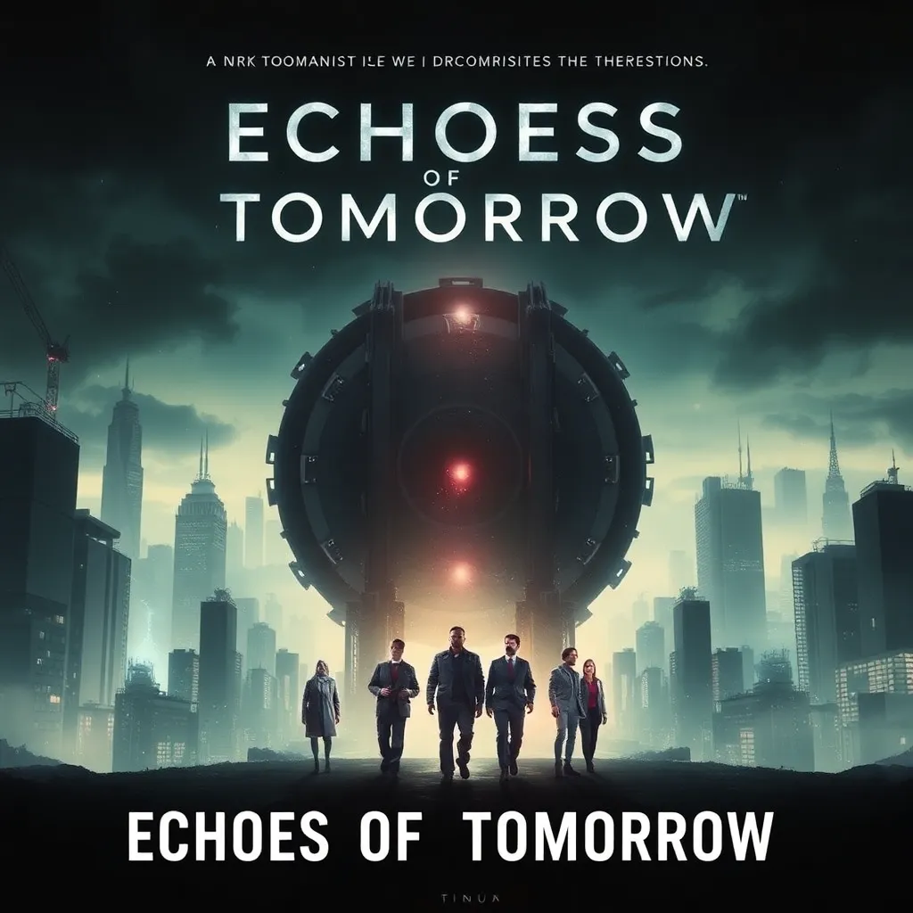 Create a movie poster for a futuristic sci-fi film titled 'Echoes of Tomorrow.' The story follows a team of scientists who discover a way to communicate with their past selves, but soon find themselves trapped in a time loop. The poster should feature a haunting cityscape with a subtle glow, a group of scientists in the foreground, and a sense of urgency and mystery.