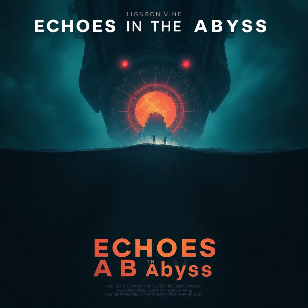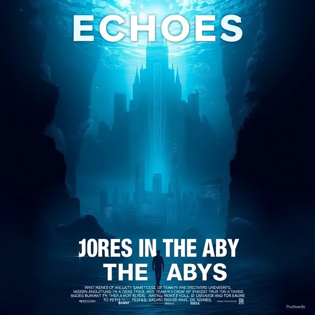 Create a captivating movie poster for a sci-fi thriller titled 'Echoes in the Abyss'. The story follows a team of deep-sea explorers who stumble upon an ancient alien city, unleashing a mysterious energy that threatens to destroy the world. Design a poster that conveys the sense of danger and discovery.