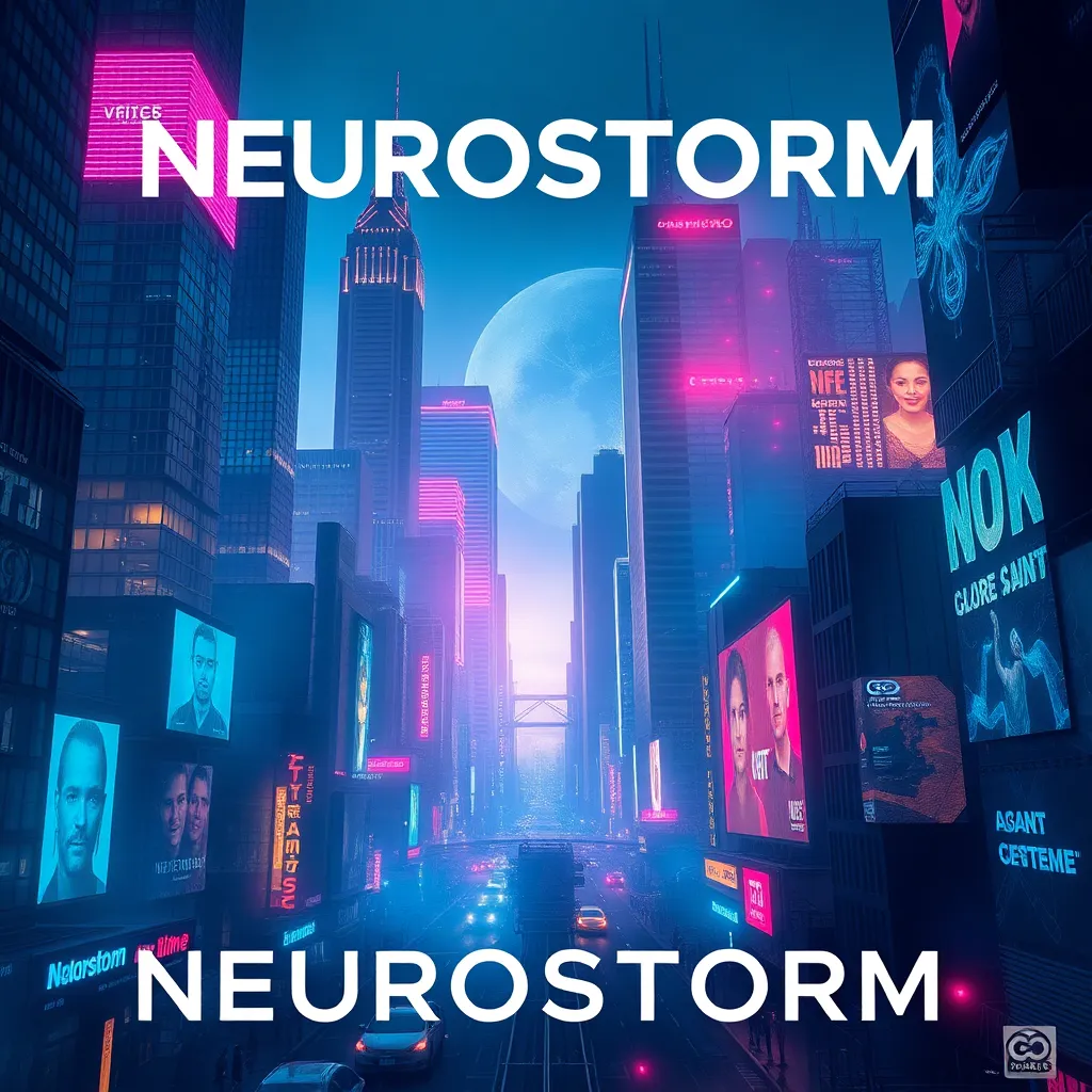 Create a movie poster for a futuristic sci-fi film titled 'Neurostorm' set in a dystopian city where a brilliant hacker must use their skills to prevent a catastrophic AI takeover. Incorporate neon-lit skyscrapers, holographic advertisements, and a futuristic cityscape with a subtle hint of chaos and rebellion.