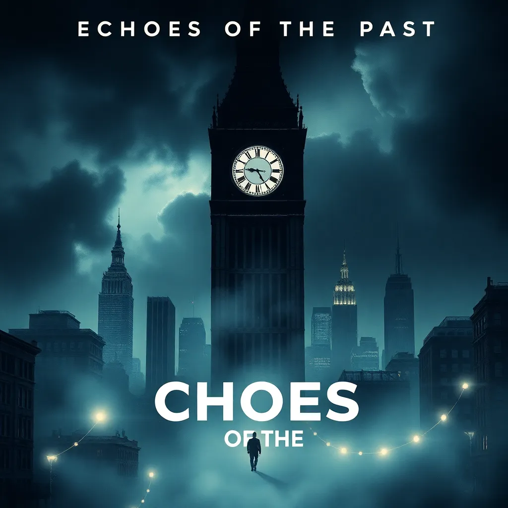 Create a movie poster for a sci-fi thriller called 'Echoes of the Past'. The story follows a group of scientists who discover a way to communicate with their past selves, but soon realize that altering the timeline has devastating consequences. The poster should feature a haunting cityscape with a clock tower looming large.