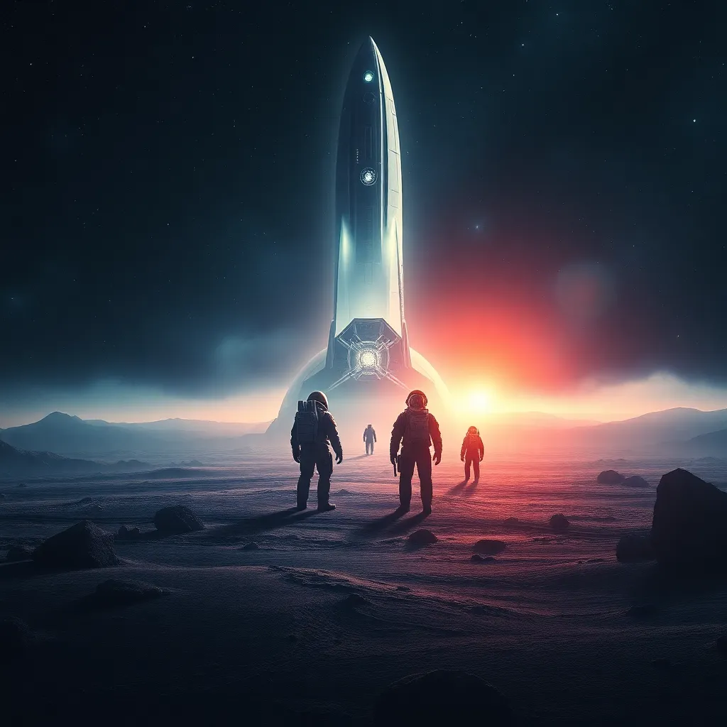 Create a futuristic sci-fi movie poster featuring a lone astronaut standing on a desolate, barren planet with a massive spaceship looming in the background. The astronaut is dressed in a worn, metallic suit with a helmet and oxygen tank. The planet's sky is a deep crimson, with a faint glow of stars