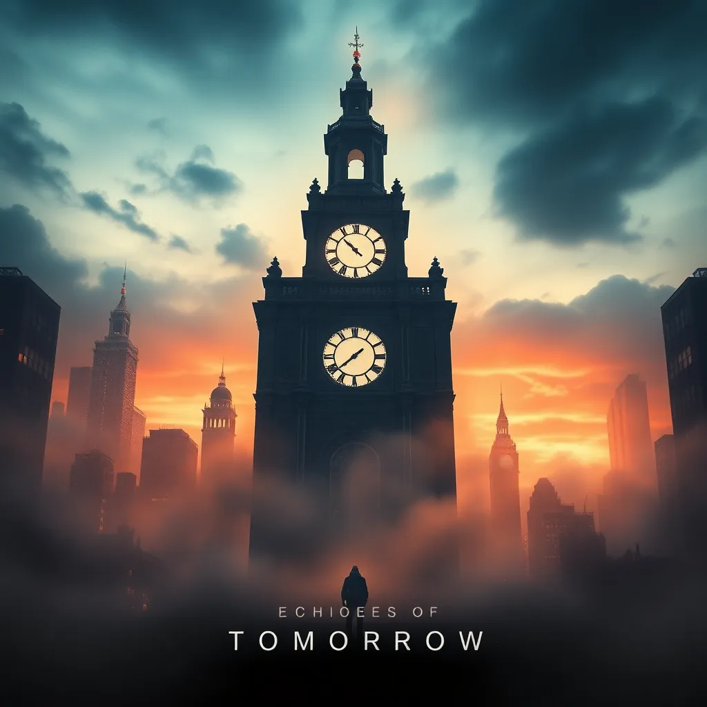 Create a captivating movie poster for a futuristic sci-fi thriller titled 'Echoes of Tomorrow'. The story follows a group of rebels as they uncover a conspiracy to manipulate time. The poster should feature a haunting cityscape at dusk, with a glowing clock tower and a lone figure in the foreground, shrouded in mist.