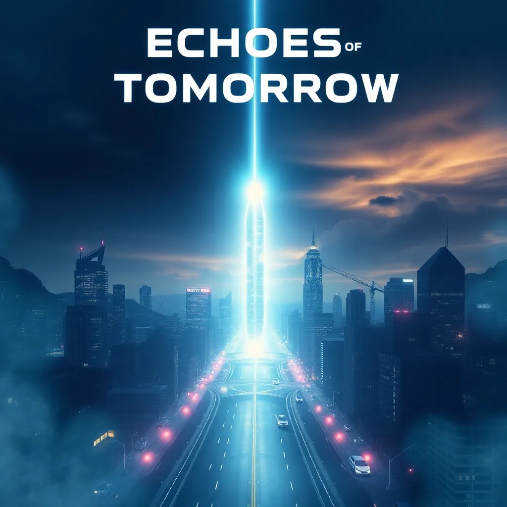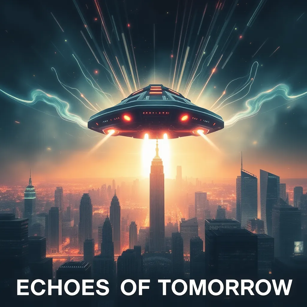 Create a movie poster for a futuristic sci-fi film titled 'Echoes of Tomorrow'. The story follows a group of scientists who discover a way to communicate with their past selves. The poster should feature a dramatic cityscape with a time-traveling spaceship hovering above, surrounded by swirling lights and a sense of urgency.