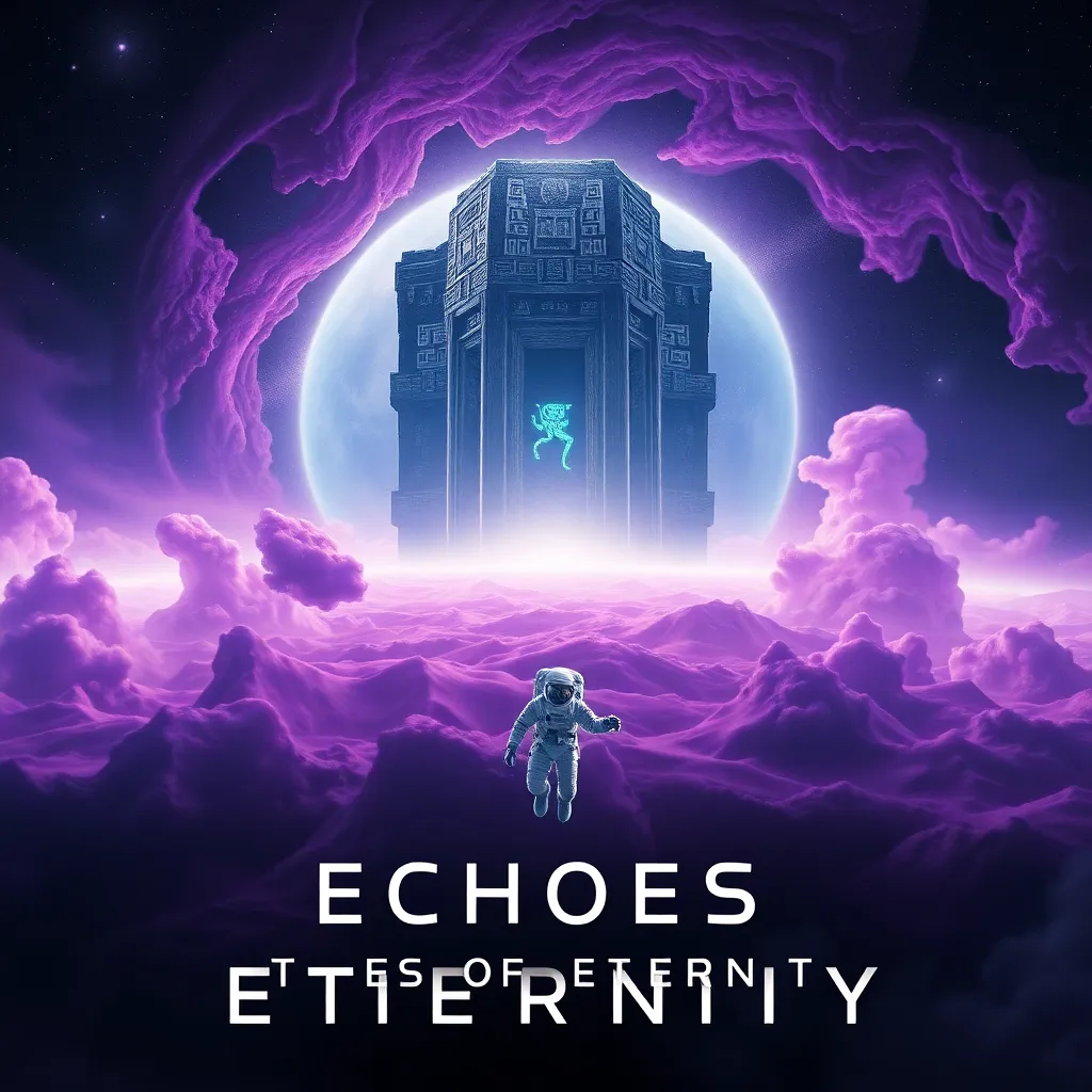 Create a futuristic sci-fi movie poster for a film titled 'Echoes of Eternity'. Depict a lone astronaut floating in zero gravity, surrounded by swirling purple and blue nebulas. In the distance, a massive, ancient alien structure looms, with eerie, glowing hieroglyphics etched into its surface. Incorporate a sense of mystery and otherworldliness.