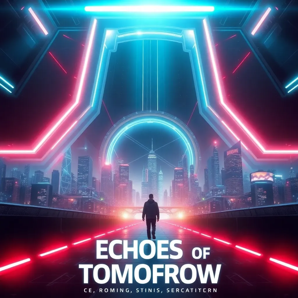 Create a futuristic sci-fi movie poster for a film titled 'Echoes of Tomorrow'. The story follows a team of scientists who discover a way to communicate with their future selves, but soon find themselves trapped in a time loop. The poster should feature a blend of neon lights, futuristic cityscapes, and a sense of urgency.